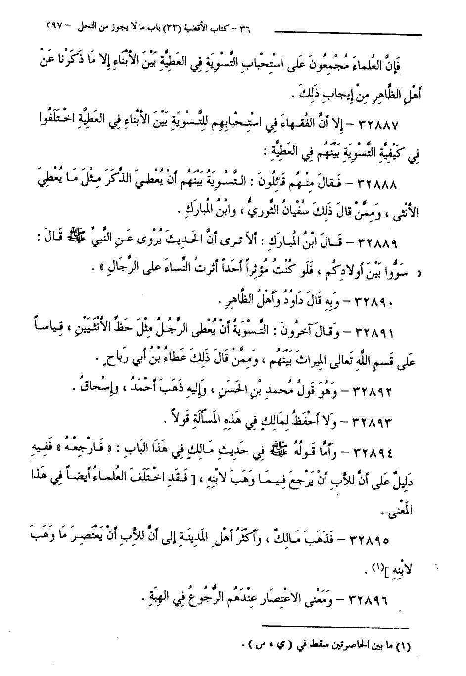 32889 - قَالَ ابْنُ الْمُبَارَكِ: أَلَا تَرَى أَنَّ الْحَدِيثَ يُرْوَى عَنِ النَّبِيِّ - صَلَّى اللَّهُ عَلَيْهِ وَسَلَّمَ - قَالَ:سَوُّوا بَيْنَ أَوْلَادِكُمْ، فَلَوْ كُنْتُ مُؤُثِرًا أَحَدًا أَثَرْتُ النِّسَاءَ عَلَى الرِّجَالِ.
