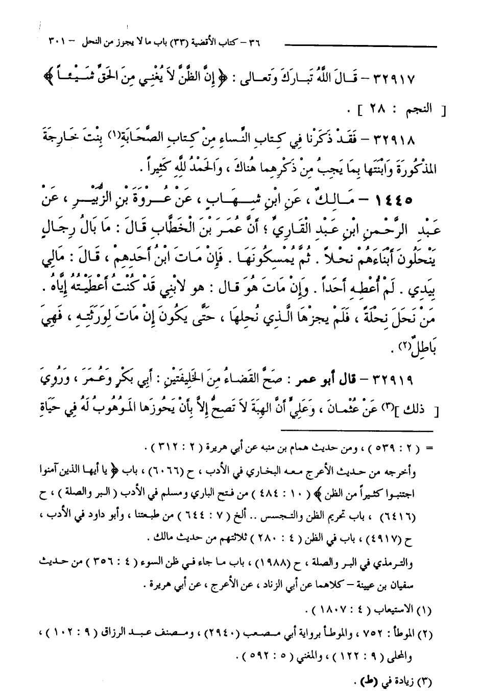 1445 - مَالِكٌ، عَنِ ابْنِ شِهَابٍ، عَنْ عُرْوَةَ بْنِ الزُّبَيْرِ، عَنْ عَبْدِ الرَّحْمَنِ بْنِ عَبْدِ الْقَارِيِّ ; أَنَّ عُمَرَ بْنَ الْخَطَّابِ قَالَ: مَا بَالُ رِجَالٍ يَنْحَلُونَ أَبْنَاءَهُمْ نُحْلًا ثُمَّ يُمْسِكُونَهَا. فَإِنْ مَاتَ ابْنُ أَحَدِهِمْ، قَالَ: مَالِي بِيَدِي. لَمْ أُعْطِهِ أَحَدًا. وَإِنْ مَاتَ هُوَ قَالَ: هُوَ لِابْنِي قَدْ كُنْتُ أَعْطَيْتُهُ إِيَّاهُ. مَنْ نَحَلَ نِحْلَةً، فَلَمْ يُحزْهَا الَّذِي نَحَلَهَا، حَتَّى يَكُونَ إِنْ مَاتَ لِوَرَثَتِهِ، فَهِيَ بَاطِلٌ.
