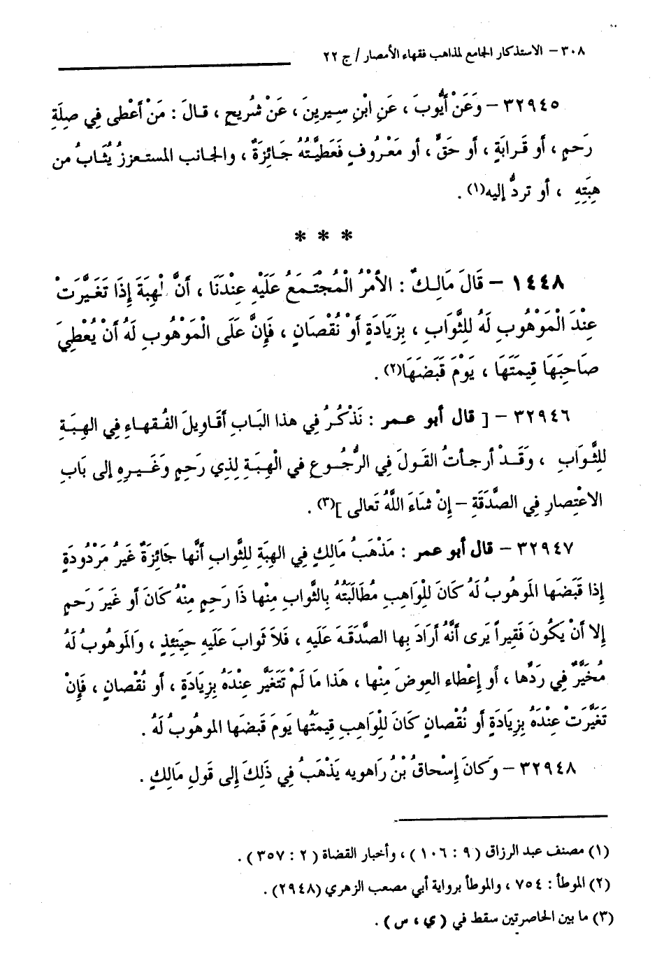 32946 - قَالَ أَبُو عُمَرَ: نَذْكُرُ فِي هَذَا الْبَابِ أَقَاوِيلَ الْفُقَهَاءِ فِي الْهِبَةِ لِلثَّوَابِ، وَقَدْ أَرْجَأْتُ الْقَوْلَ فِي الرُّجُوعِ فِي الْهِبَةِ لِذِي رَحِمٍ وَغَيْرِهِ إِلَى بَابِ الِاعْتِصَارِ فِي الصَّدَقَةِ - إِنْ شَاءَ اللَّهُ تَعَالَى.