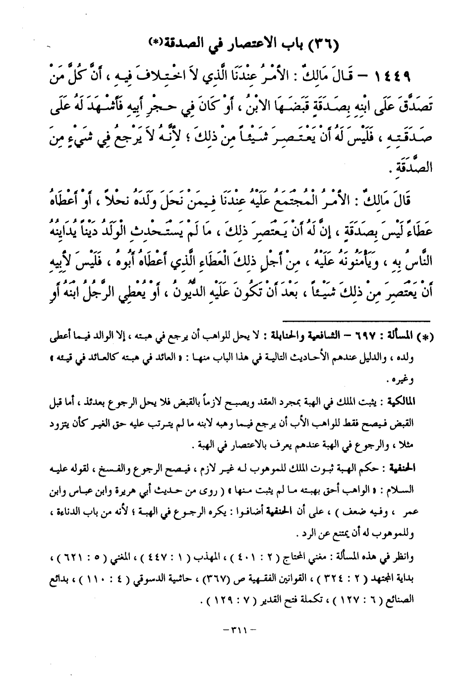 1449 - قَالَ مَالِكٌ: الْأَمْرُ عِنْدَنَا الَّذِي لَا اخْتِلَافَ فِيهِ، أَنَّ كُلَّ مَنْ تَصَدَّقَ عَلَى ابْنِهِ بِصَدَقَةٍ قَبَضَهَا الِابْنُ، أَوْ كَانَ فِي حِجْرِ أَبِيهِ فَأَشْهَدَ لَهُ عَلَى صَدَقَتِهِ، فَلَيْسَ لَهُ أَنْ يَعْتَصِرَ شَيْئًا مِنْ ذَلِكَ ; لِأَنَّهُ لَا يُرْجَعُ فِي شَيْءٍ مِنَ الصَّدَقَةِ.