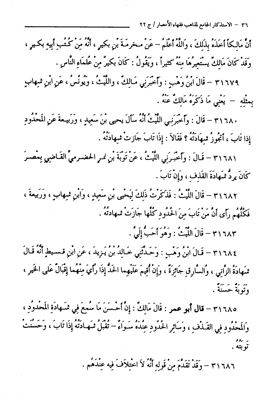 31682 - قَالَ اللَّيْثُ: فَذَكَرْتُ ذَلِكَ لِيَحْيَى بْنِ سَعِيدٍ، وَابْنِ شِهَابٍ، وَرَبِيعَةَ، فَكُلُّهُمْ رَأَى أَنَّ مَنْ تَابَ مِنَ الْحُدُودِ كُلِّهَا جَازَتْ شَهَادَتُهُ.
