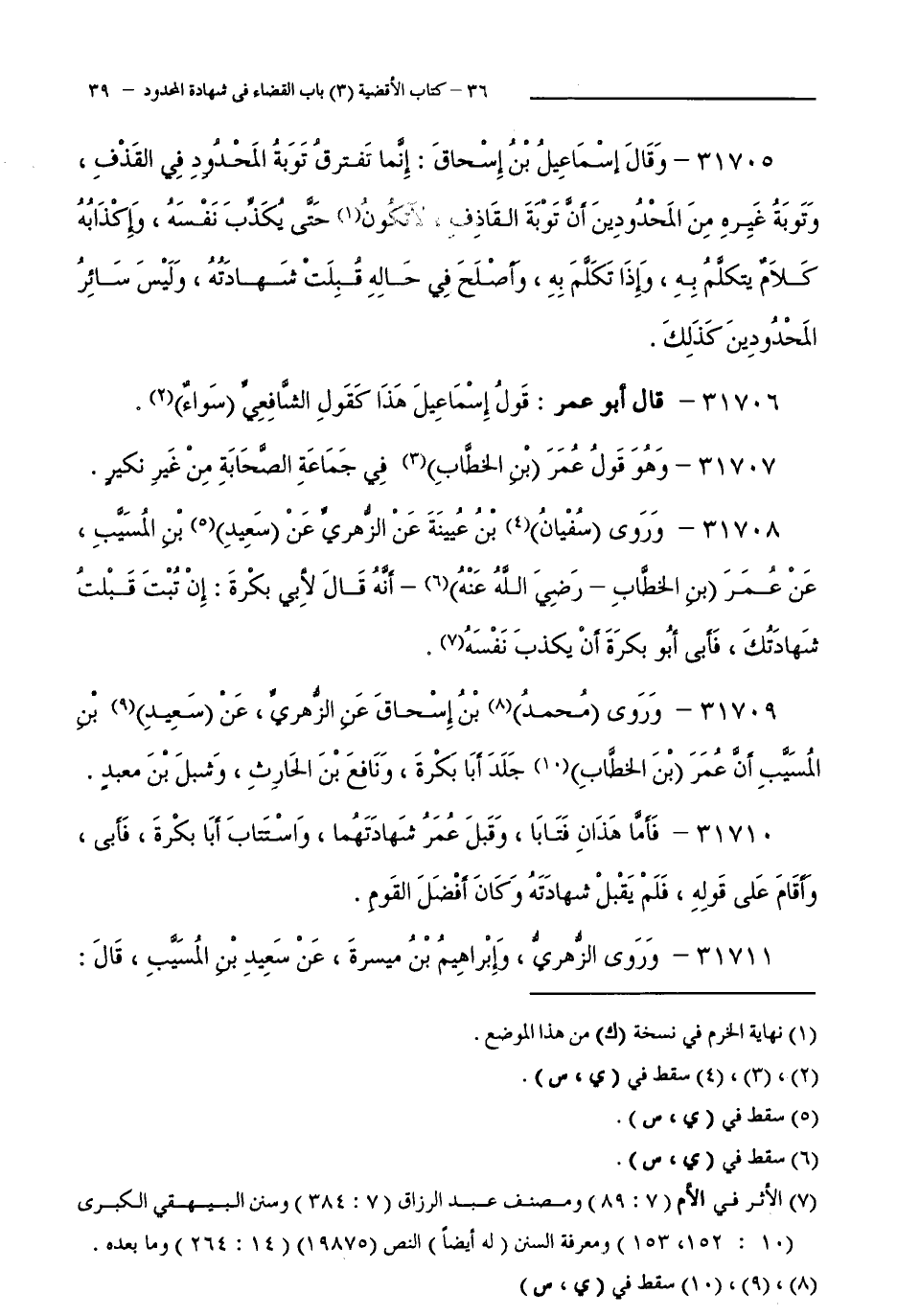 31709 - وَرَوَى مُحَمَّدُ بْنُ إِسْحَاقَ عَنِ الزُّهْرِيِّ، عَنْ سَعِيدِ بْنِ الْمُسَيَّبِ أَنَّ عُمَرَ بْنَ الْخَطَّابِ جَلَدَ أَبَا بَكْرَةَ، وَنَافِعَ بْنَ الْحَارِثِ، وَشِبْلَ بْنَ مَعْبَدٍ.