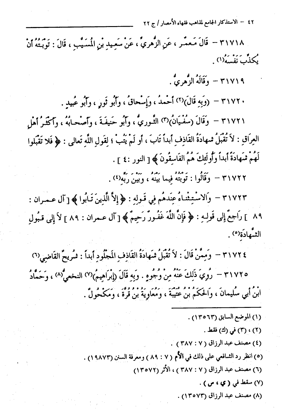31721 - وَقَالَ سُفْيَانُ الثَّوْرِيُّ، وَأَبُو حَنِيفَةَ، وَأَصْحَابُهُ، وَأَكْثَرُ أَهْلِ الْعِرَاقِ: لَا تُقْبَلُ شَهَادَةُ الْقَاذِفِ أَبَدًا، تَابَ أَوْ لَمْ يَتُبْ ; لِقَوْلِ اللَّهِ تَعَالَى:وَلَا تَقْبَلُوا لَهُمْ شَهَادَةً أَبَدًا وَأُولَئِكَ هُمُ الْفَاسِقُونَ [ النُّورِ: 4 ].