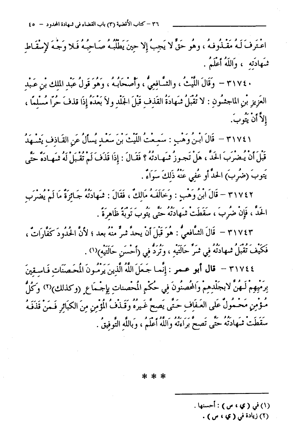 31740 - وَقَالَ اللَّيْثُ، وَالشَّافِعِيُّ، وَأَصْحَابُهُ، وَهُوَ قَوْلُ عَبْدِ الْمَلِكِ بْنِ عَبْدِ الْعَزِيزِ بْنِ الْمَاجِشُونِ: لَا تُقْبَلُ شَهَادَةُ الْقَذِفِ قَبْلَ الْجَلْدِ وَلَا بَعْدَهُ إِذَا قَذَفَ حُرًّا مُسْلِمًا، إِلَّا أَنْ يَتُوبَ.