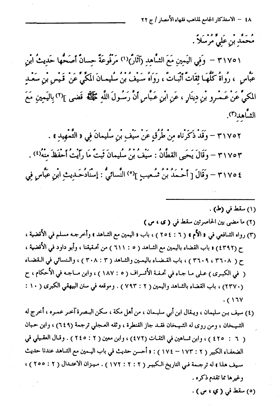 31751 - وَفِي الْيَمِينِ مَعَ الشَّاهِدِ آثَارٌ مَرْفُوعَةٌ حِسَانٌ أَصَحُّهَا حَدِيثُ ابْنِ عَبَّاسٍ، رُوَاةُ كُلِّهَا ثِقَاتٌ أَثْبَاتٌ، رَوَاهُ سَيْفُ بْنُ سُلَيْمَانَ الْمَكِّيُّ عَنْ قَيْسِ بْنِ سَعْدٍ الْمَكِّيِّ عَنْ عَمْرِو بْنِ دِينَارٍ، عَنِ ابْنِ عَبَّاسٍأَنَّ رَسُولَ اللَّهِ - صَلَّى اللَّهُ عَلَيْهِ وَسَلَّمَ - قَضَى بِالْيَمِينِ مَعَ الشَّاهِدِ.
