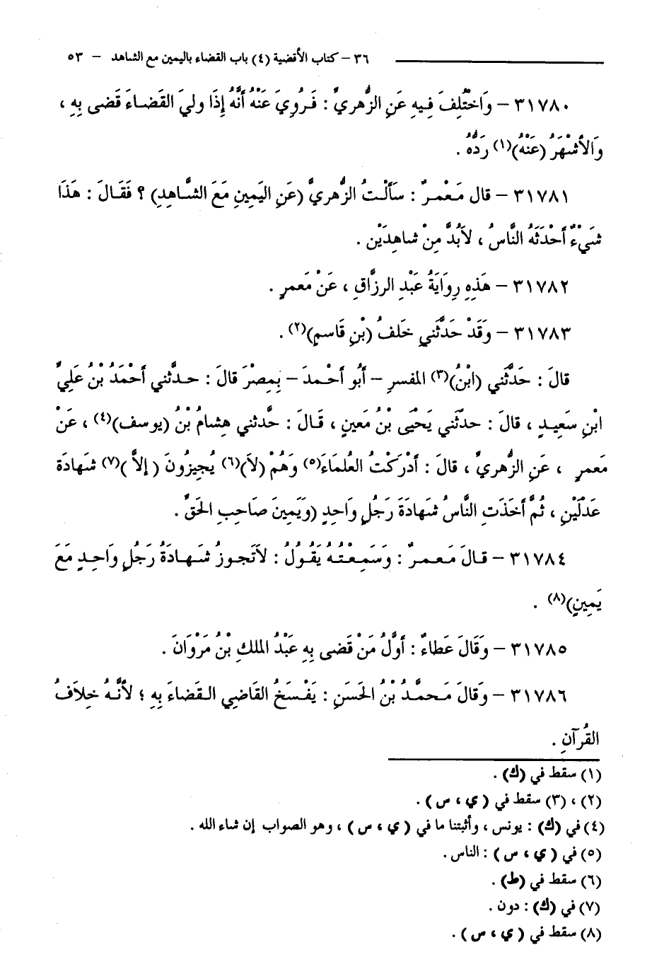 31781 - قَالَ مَعْمَرٌ: سَأَلْتُ الزُّهْرِيَّ عَنِ الْيَمِينِ مَعَ الشَّاهِدِ ؟ فَقَالَ: هَذَا شَيْءٌ أَحْدَثَهُ النَّاسُ، لَا بُدَّ مِنْ شَاهِدَيْنِ.