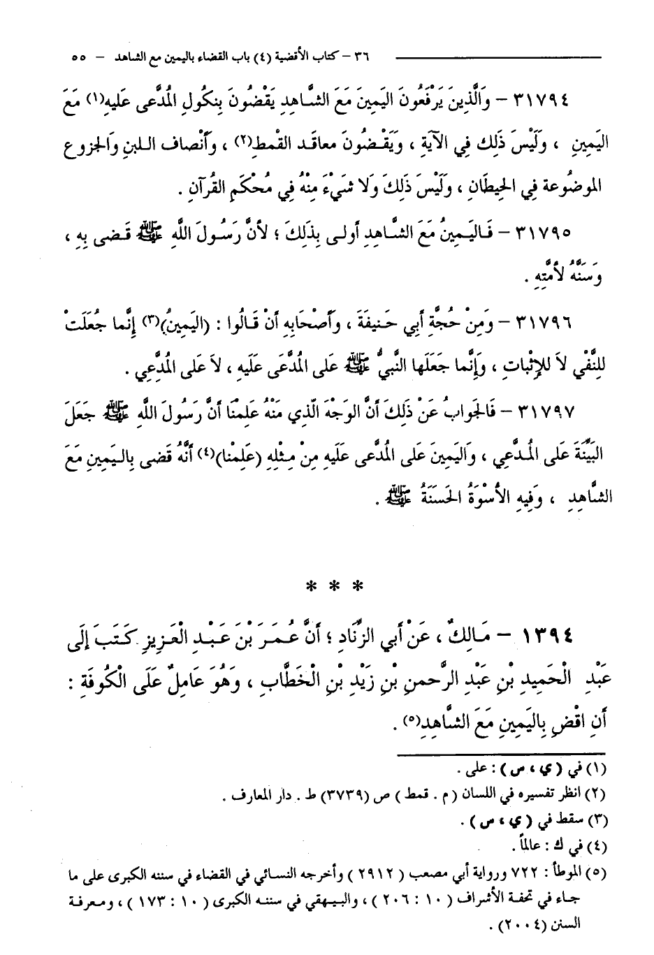 1394 - مَالِكٌ، عَنْ أَبِي الزِّنَادِ ; أَنَّ عُمَرَ بْنَ عَبْدِ الْعَزِيزِ كَتَبَ إِلَى عَبْدِ الْحَمِيدِ بْنِ عَبْدِ الرَّحْمَنِ بْنِ زَيْدِ بْنِ الْخَطَّابِ، وَهُوَ عَامِلٌ عَلَى الْكُوفَةِ: أَنِ اقْضِ بِالْيَمِينِ مَعَ الشَّاهِدِ.