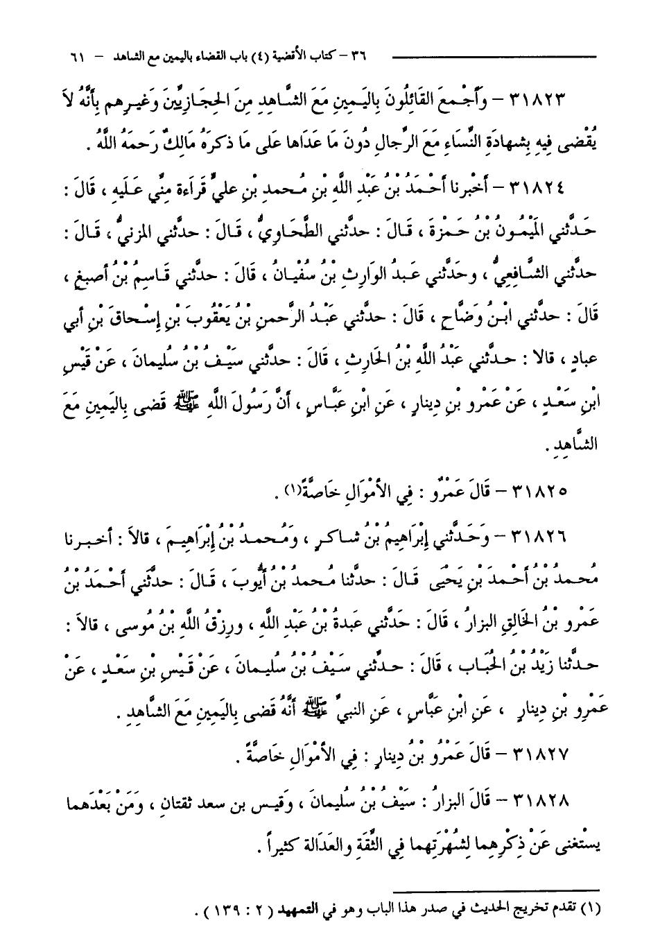 31824 - أَخْبَرَنَا أَحْمَدُ بْنُ عَبْدِ اللَّهِ بْنِ مُحَمَّدِ بْنِ عَلِيٍّ قِرَاءَةً مِنِّي عَلَيْهِ، قَالَ: حَدَّثَنِي الْمَيْمُونُ بْنُ حَمْزَةَ، قَالَ: حَدَّثَنِي الطَّحَاوِيُّ، قَالَ: حَدَّثَنِي الْمُزَنِيُّ، قَالَ: حَدَّثَنِي الشَّافِعِيُّ، وَحَدَّثَنِي عَبْدُ الْوَارِثِ بْنُ سُفْيَانَ، قَالَ: حَدَّثَنِي قَاسِمُ بْنُ أَصْبَغَ، قَالَ: حَدَّثَنِي ابْنُ وَضَّاحٍ، قَالَ: حَدَّثَنِي عَبْدُ الرَّحْمَنِ بْنُ يَعْقُوبَ بْنِ إِسْحَاقَ بْنِ أَبِي عَبَّادٍ، قَالَا: حَدَّثَنِي عَبْدُ اللَّهِ بْنُ الْحَارِثِ، قَالَ: حَدَّثَنِي سَيْفُ بْنُ سُلَيْمَانَ، عَنْ قَيْسِ بْنِ سَعْدٍ، عَنْ عَمْرِو بْنِ دِينَارٍ، عَنِ ابْنِ عَبَّاسٍ،أَنَّ رَسُولَ - صَلَّى اللَّهُ عَلَيْهِ وَسَلَّمَ - قَضَى بِالْيَمِينِ مَعَ الشَّاهِدِ.