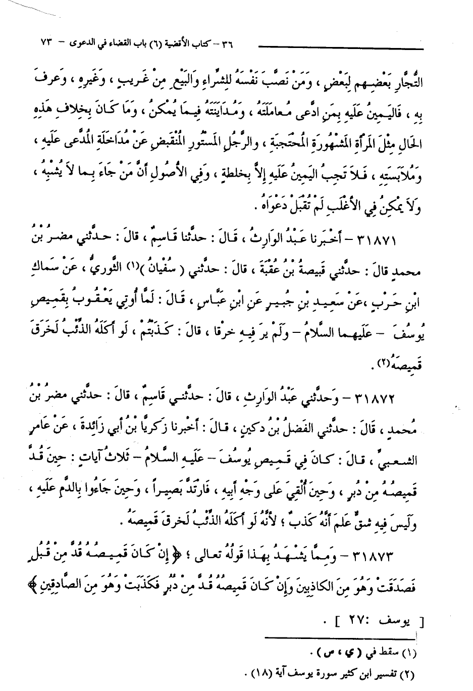 31872 - وَحَدَّثَنِي عَبْدُ الْوَارِثِ، قَالَ: حَدَّثَنِي قَاسِمٌ، قَالَ: حَدَّثَنِي مُضَرُ بْنُ مُحَمَّدٍ، قَالَ: حَدَّثَنِي الْفَضْلُ بْنُ دُكَيْنٍ، قَالَ: أَخْبَرَنَا زَكَرِيَّا بْنُ أَبِي زَائِدَةَ، عَنْ عَامِرٍ الشَّعْبِيِّ، قَالَ: كَانَ فِي قَمِيصِ يُوسُفَ - عَلَيْهِ السَّلَامُ - ثَلَاثُ آيَاتٍ: حِينَ قُدَّ قَمِيصُهُ مِنْ دُبُرٍ، وَحِينَ أُلْقِيَ عَلَى وَجْهِ أَبِيهِ، فَارْتَدَّ بَصِيرًا، وَحِينَ جَاءُوا بِالدَّمِ عَلَيْهِ، وَلَيْسَ فِيهِ شَقٌّ عَلِمَ أَنَّهُ كَذِبٌ ; لِأَنَّهُ لَوْ أَكَلَهُ الذِّئْبُ لَخَرَقَ قَمِيصَهُ.
