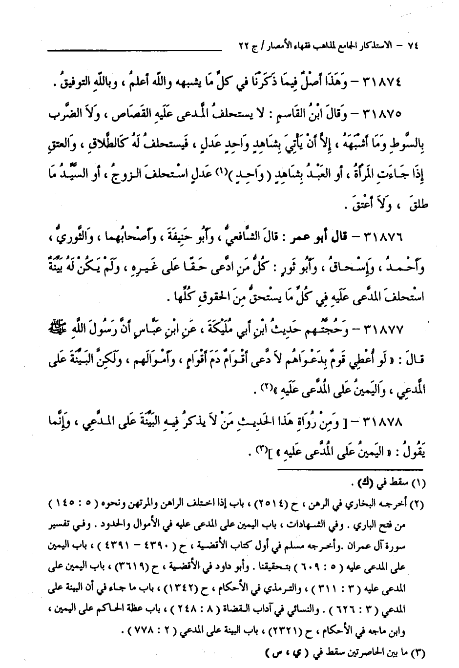 31876 - قَالَ أَبُو عُمَرَ: قَالَ الشَّافِعِيُّ، وَأَبُو حَنِيفَةَ، وَأَصْحَابُهُمَا، وَالثَّوْرِيُّ، وَأَحْمَدُ، وَإِسْحَاقُ، وَأَبُو ثَوْرٍ: كُلُّ مَنِ ادَّعَى حَقًّا عَلَى غَيْرِهِ، وَلَمْ يَكُنْ لَهُ بَيِّنَةٌ اسْتُحْلِفَ الْمُدَّعَى عَلَيْهِ فِي كُلِّ مَا يَسْتَحِقُّ مِنَ الْحُقُوقِ كُلِّهَا.