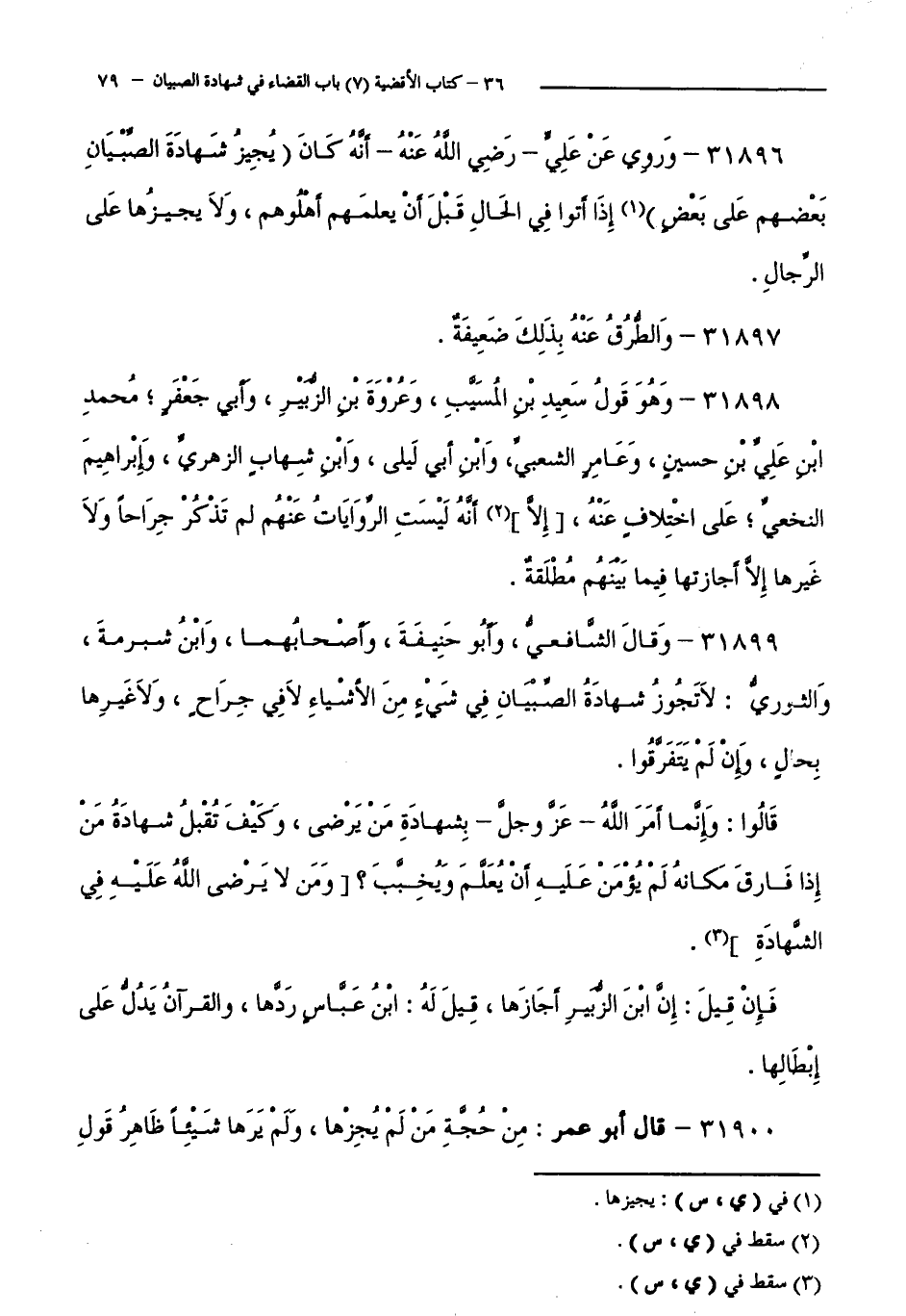 31896 - وَرُوِيَ عَنْ عَلِيٍّ - رَضِيَ اللَّهُ عَنْهُ - أَنَّهُ كَانَ يُجِيزُ شَهَادَةَ الصِّبْيَانِ بَعْضِهِمْ عَلَى بَعْضٍ إِذَا أَتَوْا فِي الْحَالِ قَبْلَ أَنْ يُعَلِّمَهُمْ أَهْلُوهُمْ، وَلَا يُجِيزُهَا عَلَى الرِّجَالِ.