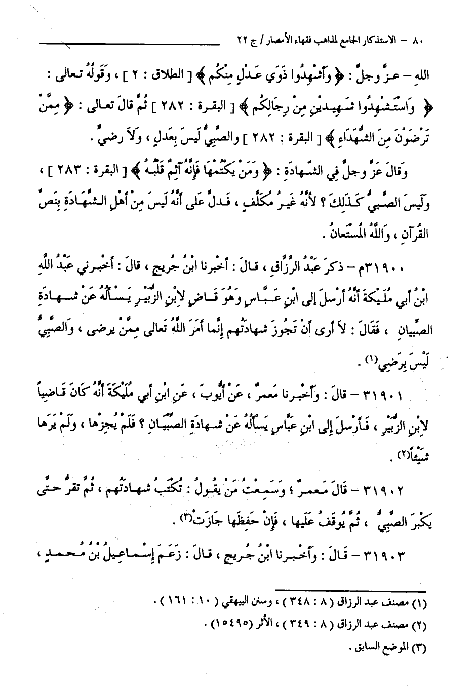 31900 م - ذَكَرَ عَبْدُ الرَّزَّاقِ، قَالَ: أَخْبَرَنَا ابْنُ جُرَيْجٍ، قَالَ: أَخْبَرَنِي عَبْدُ اللَّهِ بْنُ أَبِي مُلَيْكَةَ أَنَّهُ أَرْسَلَ إِلَى ابْنِ عَبَّاسٍ وَهُوَ قَاضٍ لِابْنِ الزُّبَيْرِ يَسْأَلُهُ عَنْ شَهَادَةِ الصِّبْيَانِ، فَقَالَ: لَا أَرَى أَنْ تَجُوزَ شَهَادَتُهُمْ إِنَّمَا أَمَرَ اللَّهُ تَعَالَى مِمَّنْ يُرْضَى، وَالصَّبِيُّ لَيْسَ بِرَضِيٍّ.