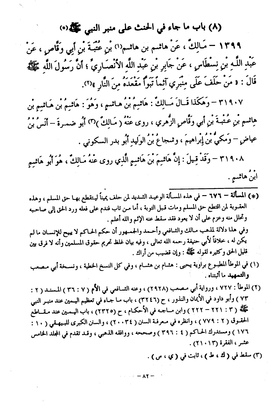 1399 - مَالِكٌ، عَنْ هَاشِمِ بْنِ هَاشِمِ بْنِ عُتْبَةَ بْنِ أَبِي وَقَّاصٍ، عَنْ عَبْدِ اللَّهِ بْنِ نِسْطَاسٍ، عَنْ جَابِرِ بْنِ عَبْدِ اللَّهِ الْأَنْصَارِيِّ ;أَنَّ رَسُولَ اللَّهِ - صَلَّى اللَّهُ عَلَيْهِ وَسَلَّمَ - قَالَ: مَنْ حَلَفَ عَلَى مِنْبَرِي آثِمًا تَبَوَّأَ مَقْعَدَهُ مِنَ النَّارِ.