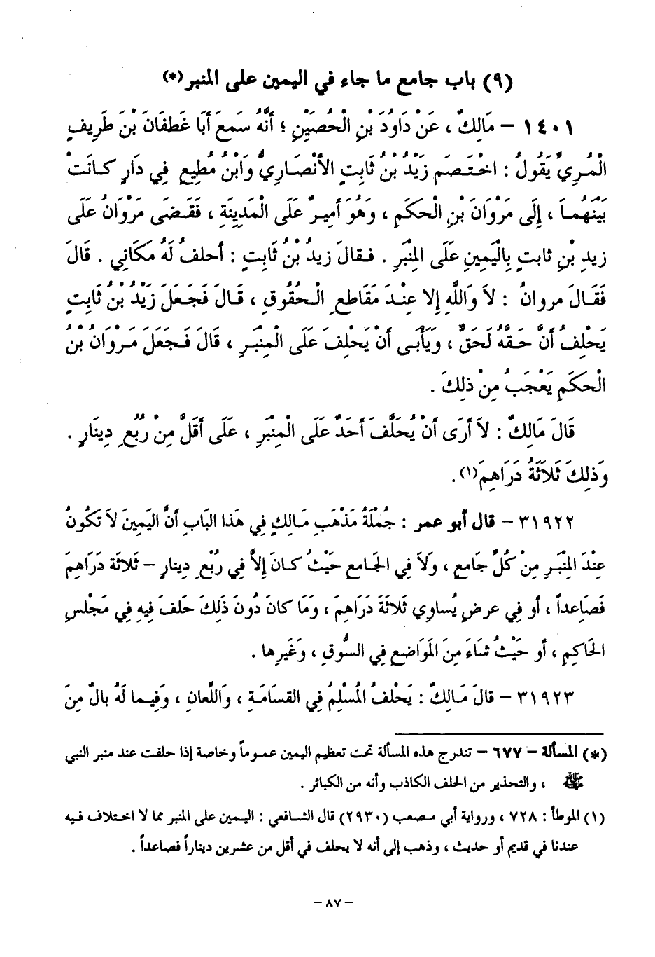 1401 - مَالِكٌ، عَنْ دَاوُدَ بْنِ الْحُصَيْنِ ; أَنَّهُ سَمِعَ أَبَا غَطْفَانَ بْنَ طَرِيفٍ الْمُرِّيَّ يَقُولُ: اخْتَصَمَ زَيْدُ بْنُ ثَابِتٍ الْأَنْصَارِيُّ وَابْنُ مُطِيعٍ فِي دَارٍ كَانَتْ بَيْنَهُمَا، إِلَى مَرْوَانَ بْنِ الْحَكَمِ، وَهُوَ أَمِيرٌ عَلَى الْمَدِينَةِ، فَقَضَى مَرْوَانُ عَلَى زَيْدِ بْنِ ثَابِتٍ بِالْيَمِينِ عَلَى الْمِنْبَرِ. فَقَالَ زَيْدُ بْنُ ثَابِتٍ: أَحْلِفُ لَهُ مَكَانِي. قَالَ: فَقَالَ مَرْوَانُ: لَا وَاللَّهِ إِلَّا عِنْدَ مَقَاطِعِ الْحُقُوقِ، قَالَ فَجَعَلَ زَيْدُ بْنُ ثَابِتٍ يَحْلِفُ أَنَّ حَقَّهُ لَحَقٌّ، وَيَأْبَى أَنْ يَحْلِفَ عَلَى الْمِنْبَرِ، قَالَ فَجَعَلَ مَرْوَانُ بْنُ الْحَكَمِ يَعْجَبُ مِنْ ذَلِكَ.
