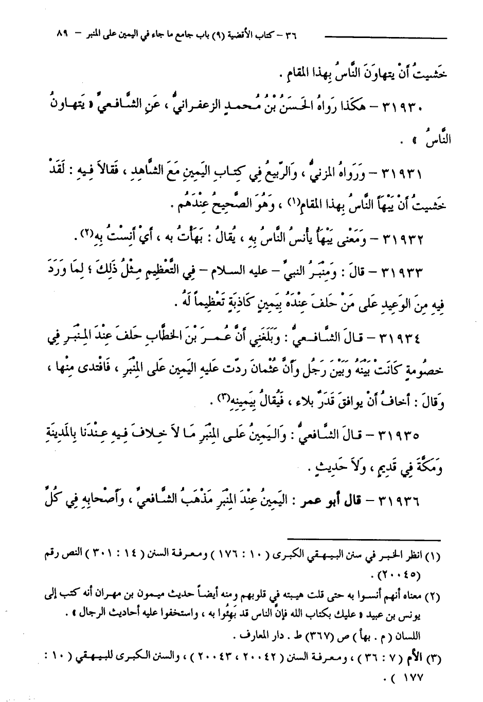 31936 - قَالَ أَبُو عُمَرَ: الْيَمِينُ عِنْدَ الْمِنْبَرِ مَذْهَبُ الشَّافِعِيِّ، وَأَصْحَابِهِ فِي كُلِّ