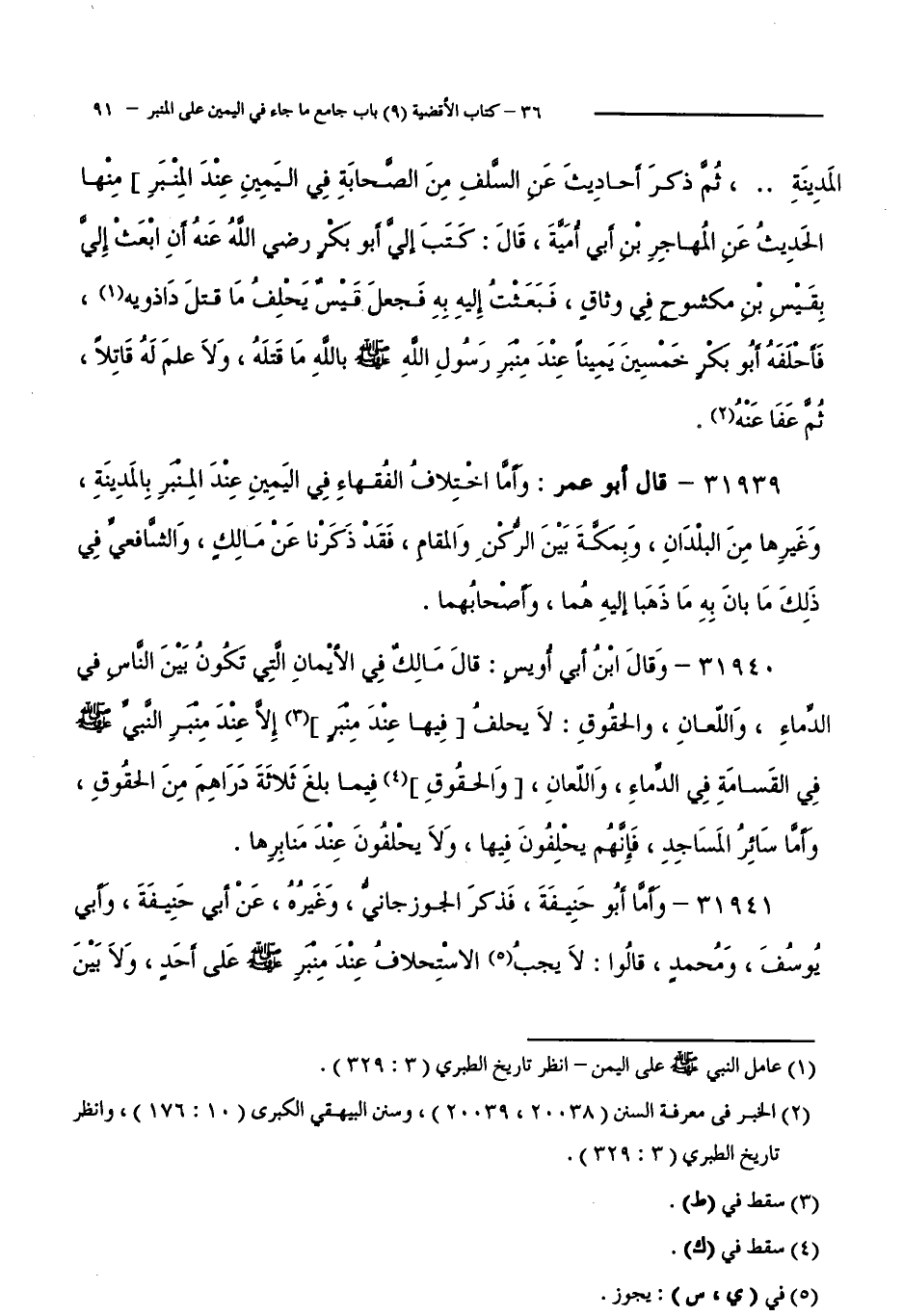 الْمَدِينَةِ..، ثُمَّ ذَكَرَ أَحَادِيثَ عَنِ السَّلَفِ مِنَ الصَّحَابَةِ فِي الْيَمِينِ عِنْدَ الْمِنْبَرِ ؛ مِنْهَا الْحَدِيثُ عَنِ الْمُهَاجِرِ بْنِ أَبِي أُمَيَّةَ، قَالَ: كَتَبَ إِلَيَّ أَبُو بَكْرٍ رَضِيَ اللَّهُ عَنْهُ أَنِ ابْعَثْ إِلَيَّ بِقَيْسِ بْنِ مَكْشُوحٍ فِي وِثَاقٍ، فَبَعَثْتُ إِلَيْهِ بِهِ فَجَعَلَ قَيْسٌ يَحْلِفُ مَا قَتَلَ دَاذَوَيْهِ، فَأَحْلَفَهُ أَبُو بَكْرٍ خَمْسِينَ يَمِينًا عِنْدَ مِنْبَرِ رَسُولِ اللَّهِ - صَلَّى اللَّهُ عَلَيْهِ وَسَلَّمَ - بِاللَّهِ مَا قَتَلَهُ، وَلَا عِلْمَ لَهُ قَاتِلًا، ثُمَّ عَفَا عَنْهُ.