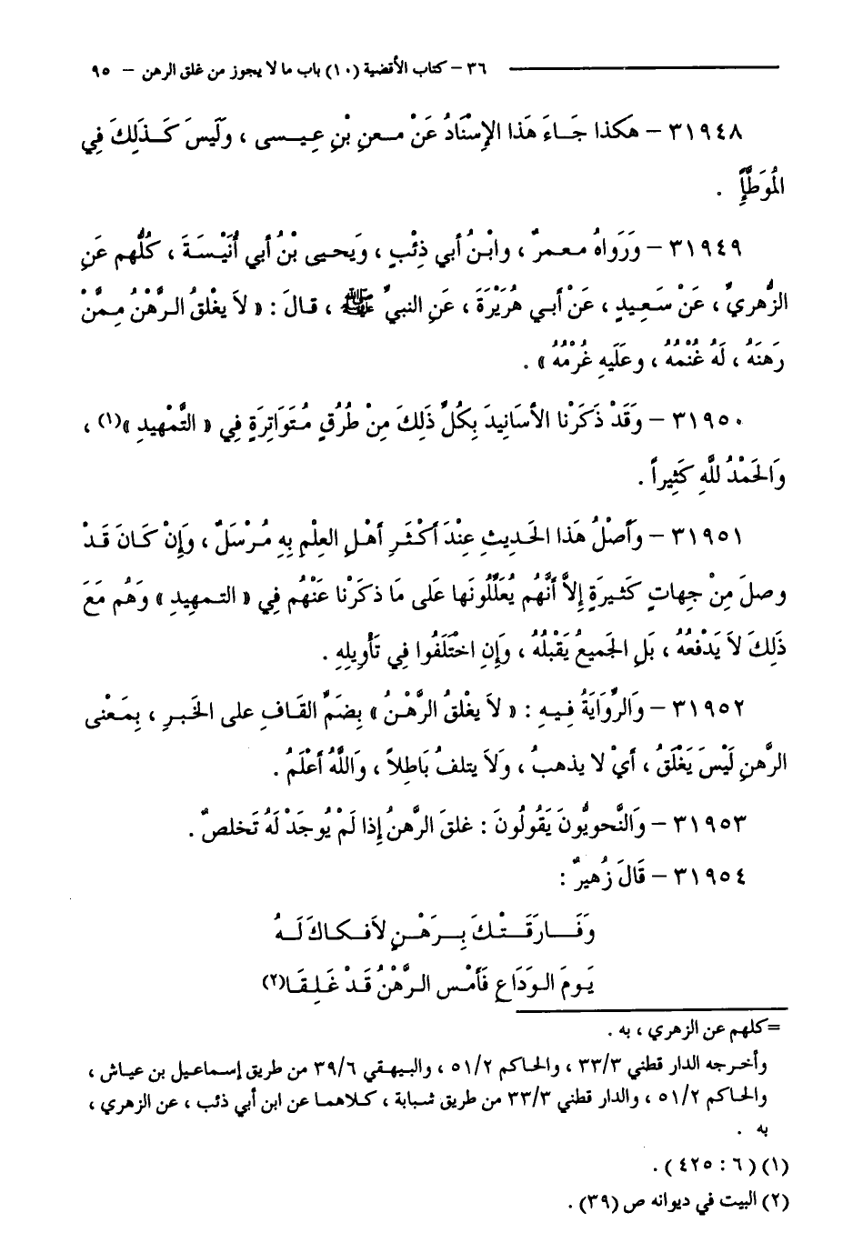 31949 - وَرَوَاهُ مَعْمَرٌ، وَابْنُ أَبِي ذِئْبٍ، وَيَحْيَى بْنُ أَبِي أُنَيْسَةَ، كُلُّهُمْ عَنِ الزُّهْرِيِّ، عَنْ سَعِيدٍ، عَنْ أَبِي هُرَيْرَةَ،عَنِ النَّبِيِّ - صَلَّى اللَّهُ عَلَيْهِ وَسَلَّمَ -، قَالَ: لَا يَغْلَقُ الرَّهْنُ مِمَّنْ رَهَنَهُ، لَهُ غُنْمُهُ، وَعَلَيْهِ غُرْمُهُ.