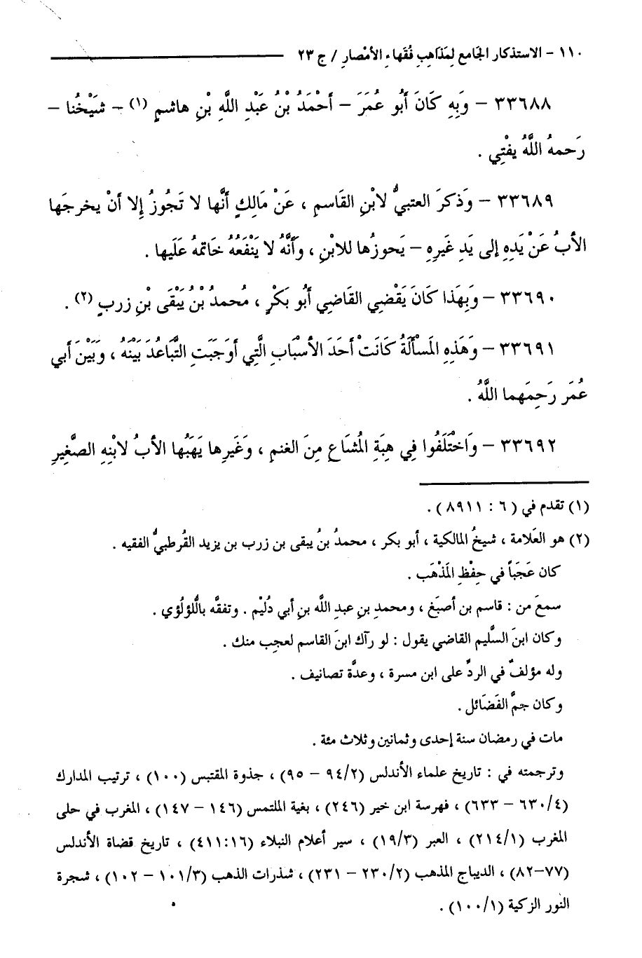 33688 - وَبِهِ كَانَ أَبُو عُمَرَ - أَحْمَدُ بْنُ عَبْدِ اللَّهِ بْنِ هَاشِمٍ - شَيْخُنَا - رَحِمَهُ اللَّهُ يُفْتِي.