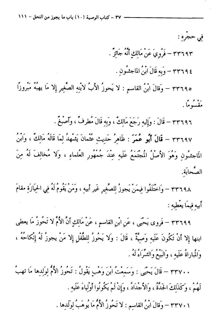 33699 - فَرَوَى يَحْيَى، عَنِ ابْنِ الْقَاسِمِ، عَنْ مَالِكٍ أَنَّ الْأُمَّ لَا تَحُوزُ مَا يُعْطَى ابْنُهَا إِلَّا أَنْ تَكُونَ عَلَيْهِ وَصِيَّةً، قَالَ: وَلَا يَحُوزُ لِلطِّفْلِ إِلَّا مَنْ يَجُوزُ لَهُ إِنْكَاحُهُ، وَالْمُبَارَاةُ عَلَيْهِ، وَالْبَيْعُ وَالشِّرَاءُ لَهُ.