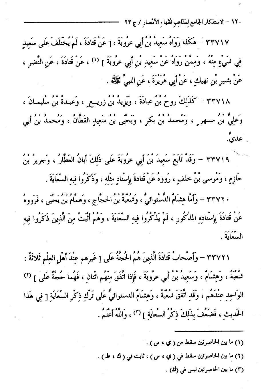 33721 - وَأَصْحَابُ قَتَادَةَ الَّذِينَ هُمُ الْحُجَّةُ عَلَى غَيْرِهِمْ عِنْدَ أَهْلِ الْعِلْمِ ثَلَاثَةٌ: شُعْبَةُ، وَهِشَامٌ، وَسَعِيدُ بْنُ أَبِي عَرُوبَةَ، فَإِذَا اتَّفَقَ مِنْهُمُ اثْنَانِ، فَهُمَا حُجَّةٌ عَلَى الْوَاحِدِ عِنْدَهُمْ، وَقَدِ اتَّفَقَ شُعْبَةُ، وَهِشَامٌ الدَّسْتَوَائِيُّ عَلَى تَرْكِ ذِكْرِ السِّعَايَةِ فِي هَذَا الْحَدِيثِ، فَضَعُفَ بِذَلِكَ ذِكْرُ السِّعَايَةِ، وَاللَّهُ أَعْلَمُ.