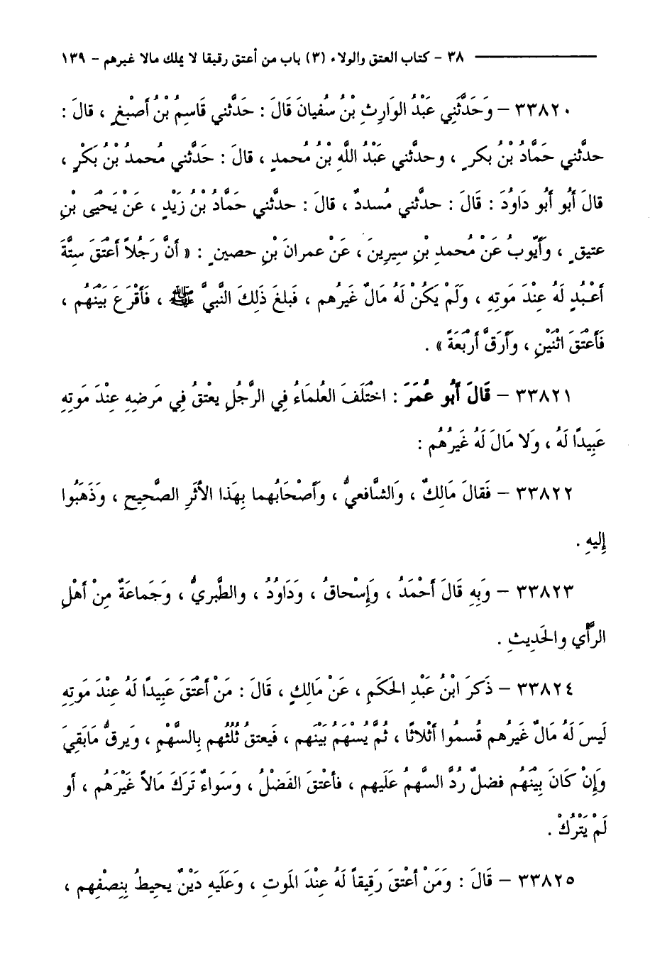 33820 - وَحَدَّثَنِي عَبْدُ الْوَارِثِ بْنُ سُفْيَانَ قَالَ: حَدَّثَنِي قَاسِمُ بْنُ أَصْبَغَ، قَالَ: حَدَّثَنِي حَمَّادُ بْنُ بَكْرٍ، وَحَدَّثَنِي عَبْدُ اللَّهِ بْنُ مُحَمَّدٍ، قَالَ: حَدَّثَنِي مُحَمَّدُ بْنُ بَكْرٍ، قَالَ أَبُو دَاوُدَ: قَالَ: حَدَّثَنِي مُسَدَّدٌ، قَالَ: حَدَّثَنِي حَمَّادُ بْنُ زَيْدٍ، عَنْ يَحْيَى بْنِ عَتِيقٍ، وَأَيُّوبَ عَنْ مُحَمَّدِ بْنِ سِيرِينَ، عَنْ عِمْرَانَ بْنِ حُصَيْنٍ: ( (أَنَّ رَجُلًا أَعْتَقَ سِتَّةَ أَعْبُدٍ لَهُ عِنْدَ مَوْتِهِ، وَلَمْ يَكُنْ لَهُ مَالٌ غَيْرُهُمْ، فَبَلَغَ ذَلِكَ النَّبِيَّ صَلَّى اللَّهُ عَلَيْهِ وَسَلَّمَ، فَأَقْرَعُ بَيْنَهُمْ، فَأَعْتَقَ اثْنَيْنِ، وَأَرَقَّ أَرْبَعَةً ) ).