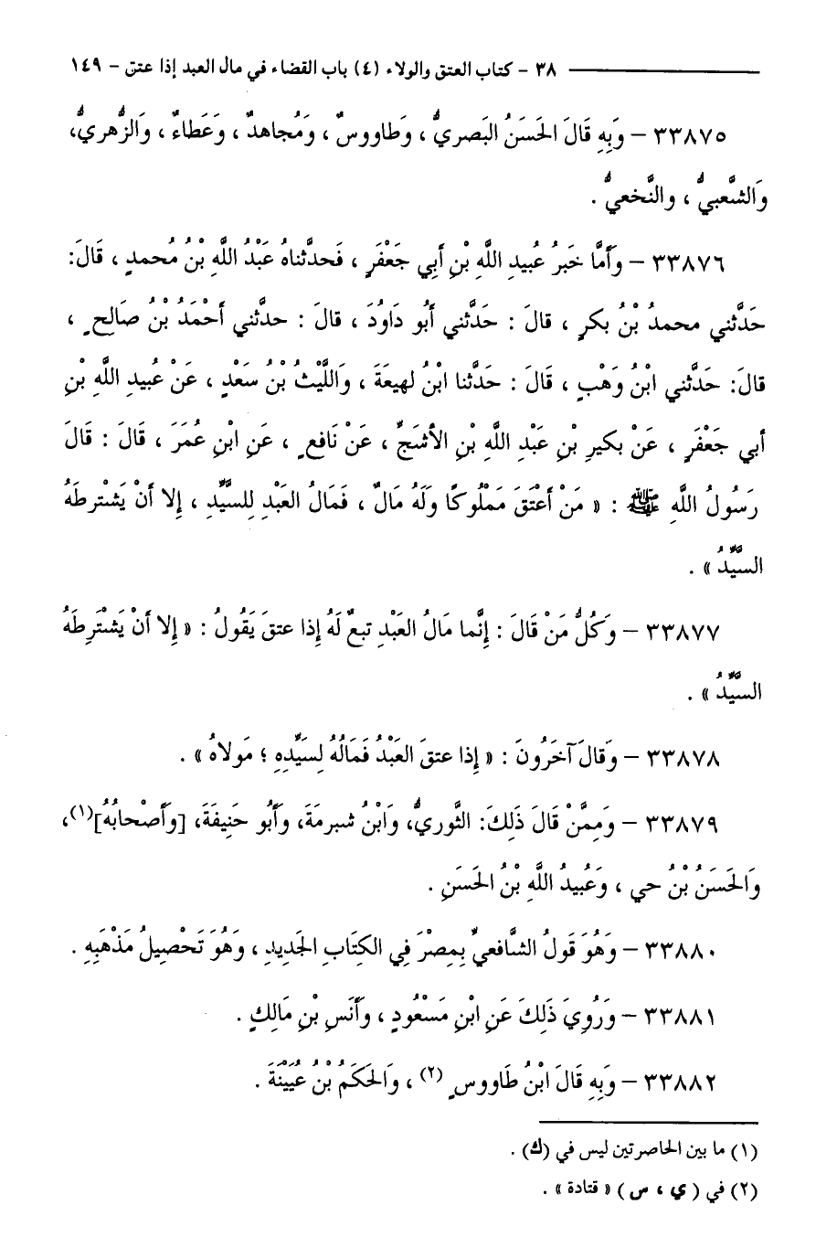 33878 - وَقَالَ آخَرُونَ: ( ( إِذَا عَتَقَ الْعَبْدُ فَمَالُهُ لِسَيِّدِهِ ; مَوْلَاهُ ) ).