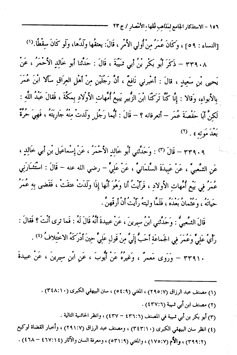33909 - قَالَ: وَحَدَّثَنِي أَبُو خَالِدٍ الْأَحْمَرُ، عَنْ إِسْمَاعِيلَ بْنِ أَبِي خَالِدٍ عَنِ الشَّعْبِيِّ، عَنْ عُبَيْدَةَ السَّلْمَانِيِّ، عَنْ عَلِيٍّ رَضِيَ اللَّهُ عَنْهُ، قَالَ: اسْتَشَارَنِي عُمَرُ فِي بَيْعِ أُمَّهَاتِ الْأَوْلَادِ، فَرَأَيْتُ أَنَا وَهُوَ أَنَّهَا إِذَا وَلَدَتْ عَتَقَتْ، فَقَضَى بِهِ عُمَرُ حَيَاتَهُ، وَعُثْمَانُ بَعْدَهُ، فَلَمَّا وَلِيتُهُ رَأَيْتُ أَنْ أَرِقَّهُنَّ.