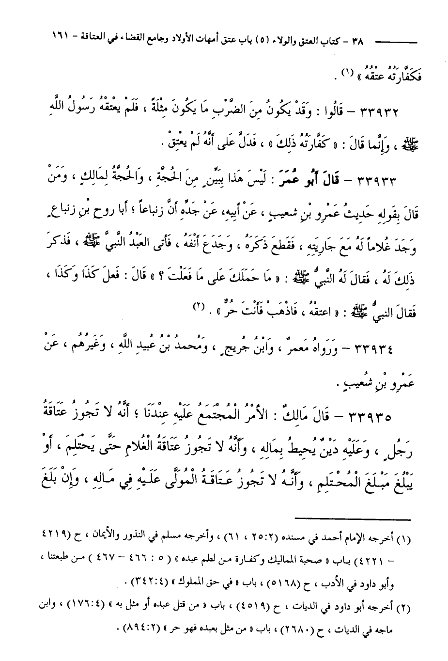 33933 - قَالَ أَبُو عُمَرَ: لَيْسَ هَذَا بَيِّنٌ مِنَ الْحُجَّةِ، وَالْحُجَّةُ لِمَالِكٍ، وَمَنْ قَالَ: بِقَوْلِهِ حَدِيثُ عَمْرِو بْنِ شُعَيْبٍ، عَنْ أَبِيهِ، عَنْ جَدِّهِأَنَّ زِنْبَاعًا - أَبَا رَوْحِ بْنِ زِنْبَاعٍ - وَجَدَ غُلَامًا لَهُ مَعَ جَارِيَتِهِ، فَقَطَعَ ذَكَرَهُ، وَجَدَعَ أَنْفَهُ، فَأَتَى الْعَبْدُ النَّبِيَّ صَلَّى اللَّهُ عَلَيْهِ وَسَلَّمَ، فَذَكَرَ ذَلِكَ لَهُ، فَقَالَ لَهُ النَّبِيُّ صَلَّى اللَّهُ عَلَيْهِ وَسَلَّمَ: ( ( مَا حَمَلَكَ عَلَى مَا فَعَلْتَ ؟ ) ) قَالَ: فَعَلَ كَذَا وَكَذَا. فَقَالَ النَّبِيُّ صَلَّى اللَّهُ عَلَيْهِ وَسَلَّمَ: ( ( اعْتِقْهُ، فَاذْهَبْ فَأَنْتَ حُرٌّ ) ).