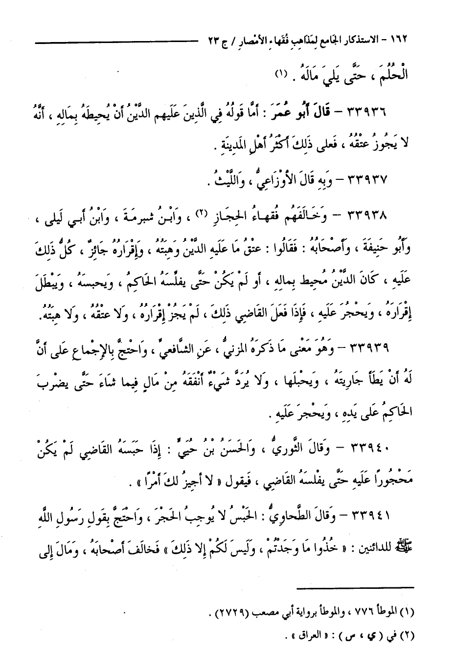 33938 - وَخَالَفَهُمْ فُقَهَاءُ الْحِجَازِ، وَابْنُ شُبْرُمَةَ، وَابْنُ أَبِي لَيْلَى، وَأَبُو حَنِيفَةَ، وَأَصْحَابُهُ فَقَالُوا: عِتْقُ مَا عَلَيْهِ الدَّيْنُ وَهِبَتُهُ، وَإِقْرَارُهُ جَائِزٌ، كُلُّ ذَلِكَ عَلَيْهِ، كَانَ الدَّيْنُ مُحِيطٌ بِمَالِهِ، أَوْ لَمْ يَكُنْ حَتَّى يُفَلِّسَهُ الْحَاكِمُ، وَيَحْبِسَهُ، وَيُبْطِلَ إِقْرَارَهُ، وَيَحْجُرَ عَلَيْهِ، فَإِذَا فَعَلَ الْقَاضِي ذَلِكَ، لَمْ يَجُزْ إِقْرَارُهُ، وَلَا عِتْقُهُ، وَلَا هِبَتُهُ.
