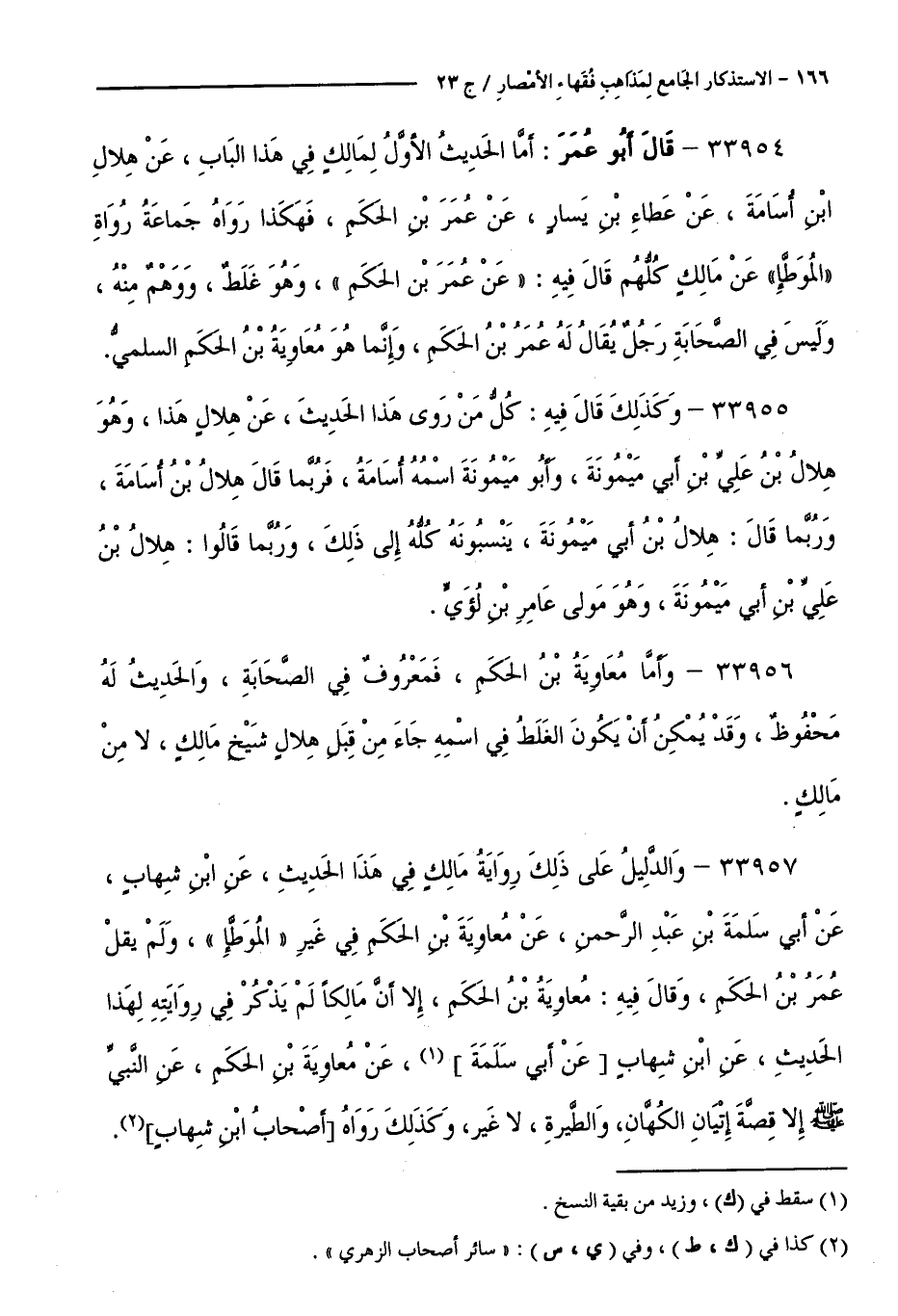 33954 - قَالَ أَبُو عُمَرَ: أَمَّا الْحَدِيثُ الْأَوَّلُ لِمَالِكٍ فِي هَذَا الْبَابِ، عَنْ هِلَالِ بْنِ أُسَامَةَ، عَنْ عَطَاءِ بْنِ يَسَارٍ، عَنْ عُمَرَ بْنِ الْحَكَمِ، فَهَكَذَا رَوَاهُ جَمَاعَةُ رُوَاةِ ( ( الْمُوَطَّأِ ) ) عَنْ مَالِكٍ كُلُّهُمْ قَالَ فِيهِ: ( ( عَنْ عُمَرَ بْنِ الْحَكَمِ ) )، وَهُوَ غَلَطٌ، وَوَهْمٌ مِنْهُ، وَلَيْسَ فِي الصَّحَابَةِ رَجُلٌ يُقَالُ: لَهُ عُمَرُ بْنُ الْحَكَمِ، وَإِنَّمَا مُعَاوِيَةُ بْنُ الْحَكَمِ السُّلَمِيُّ.