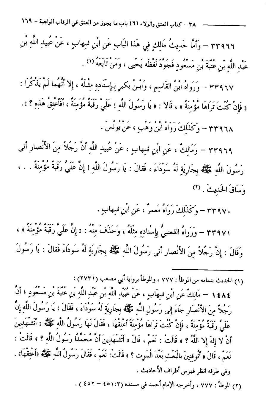 33969 - وَمَالِكٌ، عَنِ ابْنِ شِهَابٍ،عَنْ عُبَيْدِ اللَّهِ أَنَّ رَجُلًا مِنَ الْأَنْصَارِ أَتَى رَسُولَ اللَّهِ صَلَّى اللَّهُ عَلَيْهِ وَسَلَّمَ بِجَارِيَةٍ لَهُ سَوْدَاءَ، فَقَالَ: يَا رَسُولَ اللَّهِ ! إِنَّ عَلَيَّ رَقَبَةً مُؤْمِنَةً.. ) ) وَسَاقَ الْحَدِيثَ.
