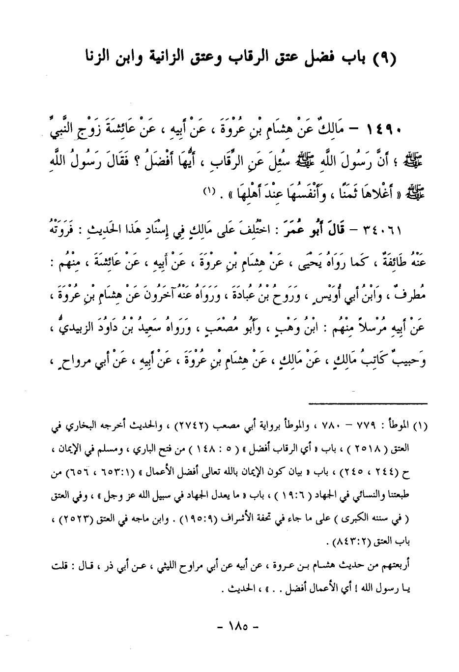 1490 - مَالِكٌ عَنْ هِشَامِ بْنِ عُرْوَةَ، عَنْ أَبِيهِ،عَنْ عَائِشَةَ زَوْجِ النَّبِيِّ صَلَّى اللَّهُ عَلَيْهِ وَسَلَّمَ ; أَنَّ رَسُولَ اللَّهِ صَلَّى اللَّهُ عَلَيْهِ وَسَلَّمَ سُئِلَ عَنِ الرِّقَابِ، أَيُّهَا أَفْضَلُ ؟ فَقَالَ رَسُولُ اللَّهِ صَلَّى اللَّهُ عَلَيْهِ وَسَلَّمَ: ( ( أَغْلَاهَا ثَمَنًا، وَأَنْفَسُهَا عِنْدَ أَهْلِهَا ) ).