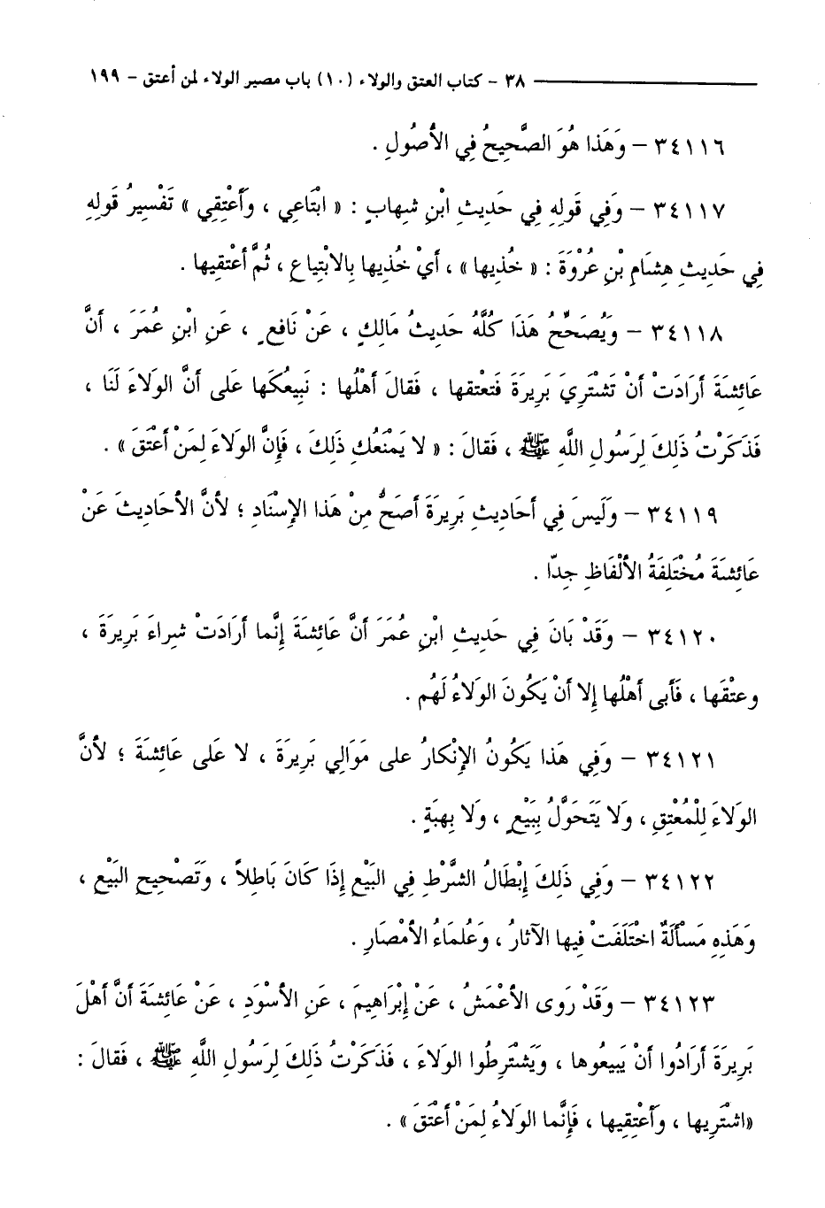 34118 - وَيُصَحِّحُ هَذَا كُلَّهُ حَدِيثُ مَالِكٍ، عَنْ نَافِعٍ، عَنِ ابْنِ عُمَرَ، أَنَّ عَائِشَةَ أَرَادَتْ أَنْ تَشْتَرِيَ بَرِيرَةَ فَتَعْتِقَهَا، فَقَالَ: أَهْلُهَا: نَبِيعُكِهَا عَلَى أَنَّ الْوَلَاءَ لَنَا، فَذَكَرَتْ ذَلِكَ لِرَسُولِ اللَّهِ صَلَّى اللَّهُ عَلَيْهِ وَسَلَّمَ، فَقَالَ: ( (لَا يَمْنَعُكِ ذَلِكَ، فَإِنَّ الْوَلَاءَ لِمَنْ أَعْتَقَ ) ).