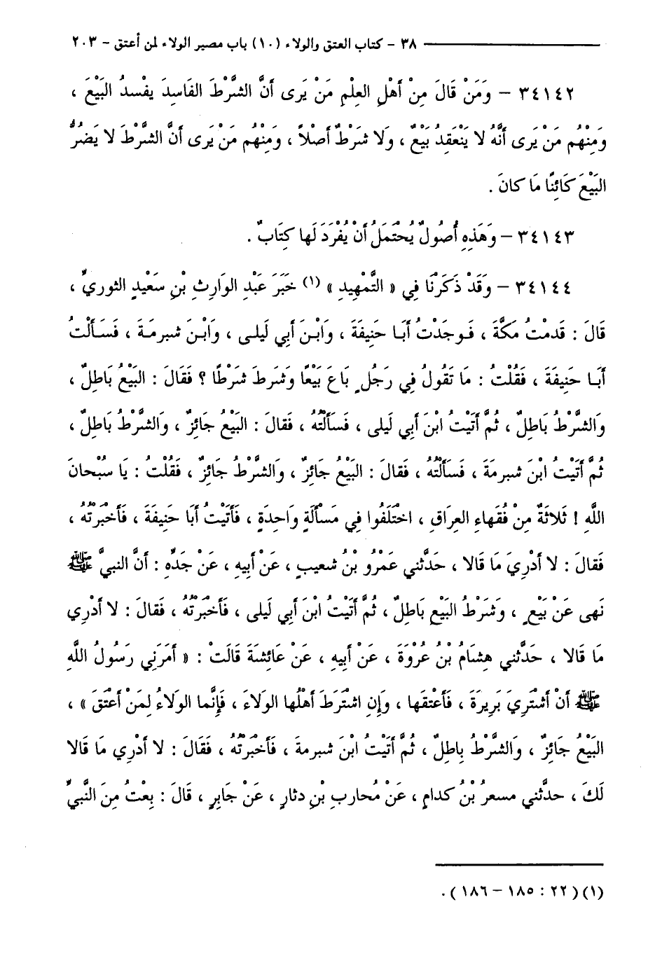 34144 - وَقَدْ ذَكَرْنَا فِي ( ( التَّمْهِيدِ ) ) خَبَرَ عَبْدِ الْوَارِثِ بْنِ سَعِيدٍ الثَّوْرِيِّ، قَالَ: قَدِمْتُ مَكَّةَ، فَوَجَدْتُ أَبَا حَنِيفَةَ، وَابْنَ أَبِي لَيْلَى، وَابْنَ شُبْرُمَةَ، فَسَأَلْتُ أَبَا حَنِيفَةَ، فَقُلْتُ: مَا تَقُولُ فِي رَجُلٍ بَاعَ بَيْعًا وَشَرَطَ شَرْطًا ؟ فَقَالَ: الْبَيْعُ بَاطِلٌ، وَالشَّرْطُ بَاطِلٌ، ثُمَّ أَتَيْتُ ابْنَ أَبِي لَيْلَى، فَسَأَلْتُهُ، فَقَالَ: الْبَيْعُ جَائِزٌ، وَالشَّرْطُ بَاطِلٌ، ثُمَّ أَتَيْتُ ابْنَ شُبْرُمَةَ، فَسَأَلْتُهُ، فَقَالَ: الْبَيْعُ جَائِزٌ، وَالشَّرْطُ جَائِزٌ، فَقُلْتُ: يَا سُبْحَانَ اللَّهِ ! ثَلَاثَةٌ مِنْ فُقَهَاءِ الْعِرَاقِ، اخْتَلَفُوا فِي مَسْأَلَةٍ وَاحِدَةٍ، فَأَتَيْتُ أَبَا حَنِيفَةَ، فَأَخْبَرْتُهُ، فَقَالَ: لَا أَدْرِي مَا قَالَا، حَدَّثَنِي عَمْرُو بْنُ شُعَيْبٍ، عَنْ أَبِيهِ، عَنْ جَدِّهِ:أَنَّ النَّبِيَّ صَلَّى اللَّهُ عَلَيْهِ وَسَلَّمَ نَهَى عَنْ بَيْعٍ، وَشَرْطُ، الْبَيْعِ بَاطِلٌ، ثُمَّ أَتَيْتُ ابْنَ أَبِي لَيْلَى، فَأَخْبَرْتُهُ، فَقَالَ: لَا أَدْرِي مَا قَالَا، حَدَّثَنِي هِشَامُ بْنُ عُرْوَةَ، عَنْ أَبِيهِ،عَنْ عَائِشَةَ قَالَتْ: ( ( أَمَرَنِي رَسُولُ اللَّهِ صَلَّى اللَّهُ عَلَيْهِ وَسَلَّمَ أَنْ أَشْتَرِيَ بَرِيرَةَ، فَأَعْتِقَهَا، وَإِنِ اشْتَرَطَ أَهْلُهَا الْوَلَاءَ، فَإِنَّمَا الْوَلَاءُ لِمَنْ أَعْتَقَ ) )، الْبَيْعُ جَائِزٌ، وَالشَّرْطُ بَاطِلٌ، ثُمَّ أَتَيْتُ ابْنَ شُبْرُمَةَ، فَأَخْبَرْتُهُ، فَقَالَ: لَا أَدْرِي مَا قَالَا لَكِ، حَدَّثَنِي مِسْعَرُ بْنُ كِدَامٍ، عَنْ مُحَارِبِ بْنِ دِثَارٍ، عَنْ جَابِرٍ، قَالَ: بِعْتُ مِنَ النَّبِيِّ