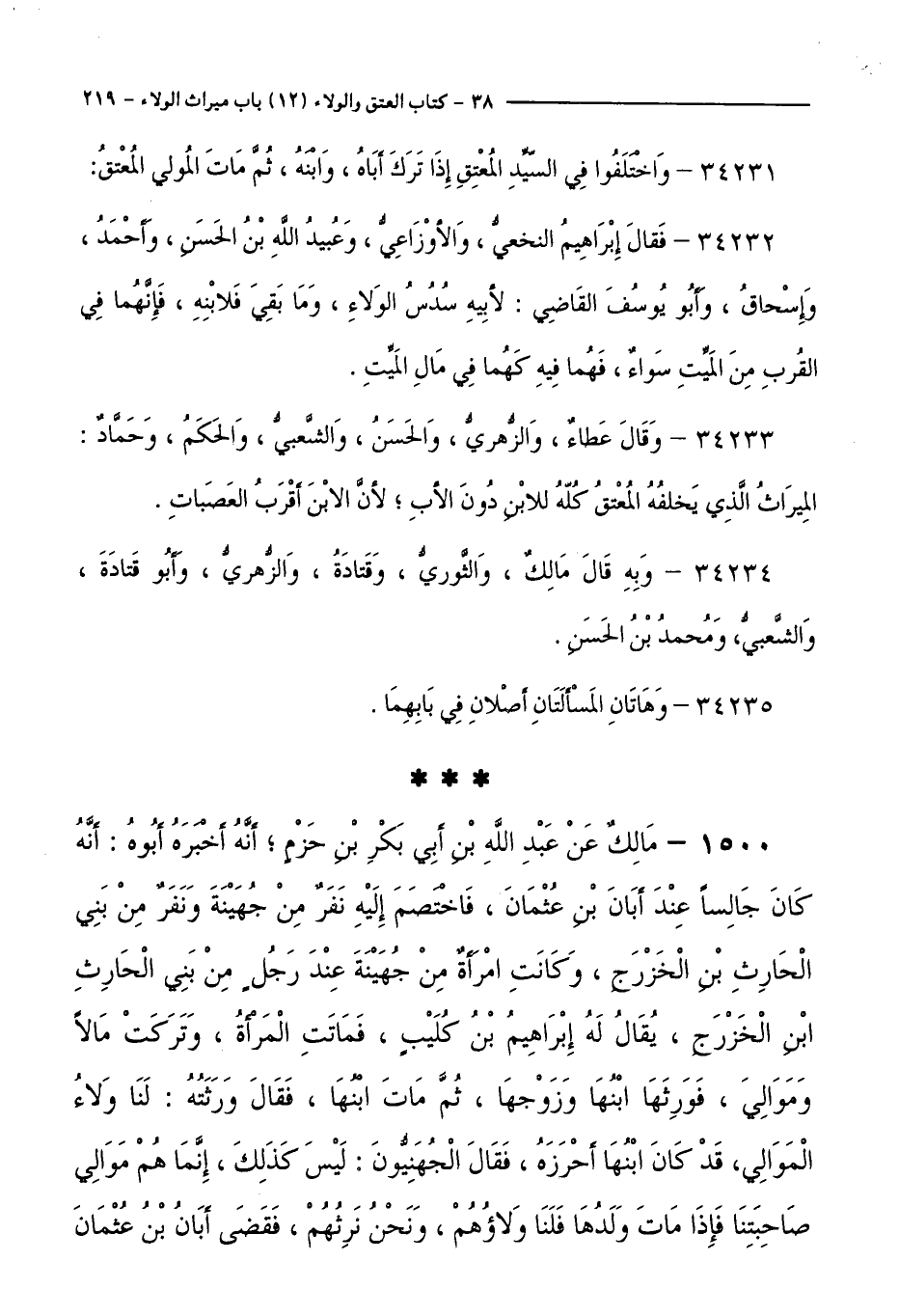 1500 - مَالِكٌ عَنْ عَبْدِ اللَّهِ بْنِ أَبِي بَكْرِ بْنِ حَزْمٍ ; أَنَّهُ أَخْبَرَهُ أَبُوهُ: أَنَّهُ كَانَ جَالِسًا عِنْدَ أَبَانَ بْنِ عُثْمَانَ، فَاخْتَصَمَ إِلَيْهِ نَفَرٌ مِنْ جُهَيْنَةَ وَنَفَرٌ مَنْ بَنِي الْحَارِثِ بْنِ الْخَزْرَجِ، وَكَانَتِ امْرَأَةُ مِنْ جُهَيْنَةَ عِنْدَ رَجُلٍ مِنْ بَنِي الْحَارِثِ بْنِ الْخَزْرَجِ، يُقَالُ: لَهُ إِبْرَاهِيمُ بْنُ كُلَيْبٍ، فَمَاتَتِ الْمَرْأَةُ، وَتَرَكَتْ مَالًا وَمَوَالِيَ، فَوَرِثَهَا ابْنُهَا وَزَوْجُهَا، ثُمَّ مَاتَ ابْنُهَا، فَقَالَ وَرَثَتُهُ: لَنَا وَلَاءُ الْمَوَالِي، قَدْ كَانَ ابْنُهَا أَحْرَزَهُ، فَقَالَ الْجُهَنِيُّونَ: لَيْسَ كَذَلِكَ، إِنَّمَا هُمْ مَوَالِي صَاحِبَتِنَا فَإِذَا مَاتَ وَلَدُهَا فَلَنَا وَلَاؤُهُمْ، وَنَحْنُ نَرِثُهُمْ، فَقَضَى أَبَانُ بْنُ عُثْمَانَ