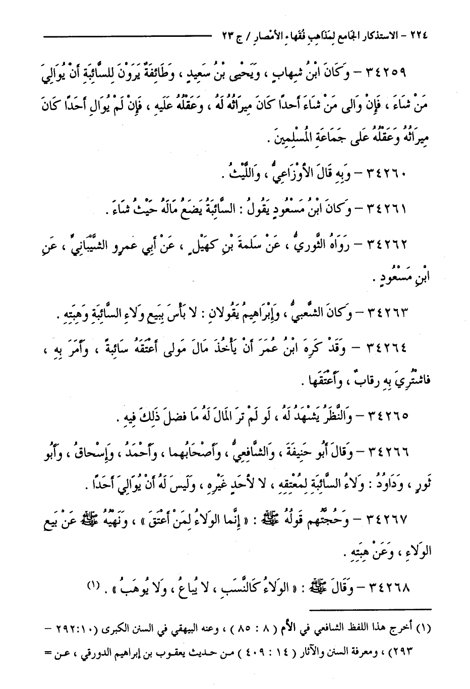34259 - وَكَانَ ابْنُ شِهَابٍ، وَيَحْيَى بْنُ سَعِيدٍ، وَطَائِفَةٌ يَرَوْنَ لِلسَّائِبَةِ أَنْ يُوَالِيَ مَنْ شَاءَ، فَإِنْ وَالَى مَنْ شَاءَ أَحَدًا كَانَ مِيرَاثُهُ لَهُ، وَعَقْلُهُ عَلَيْهِ، فَإِنْ لَمْ يُوَالِ أَحَدًا كَانَ مِيرَاثُهُ وَعَقْلُهُ عَلَى جَمَاعَةِ الْمُسْلِمِينَ.