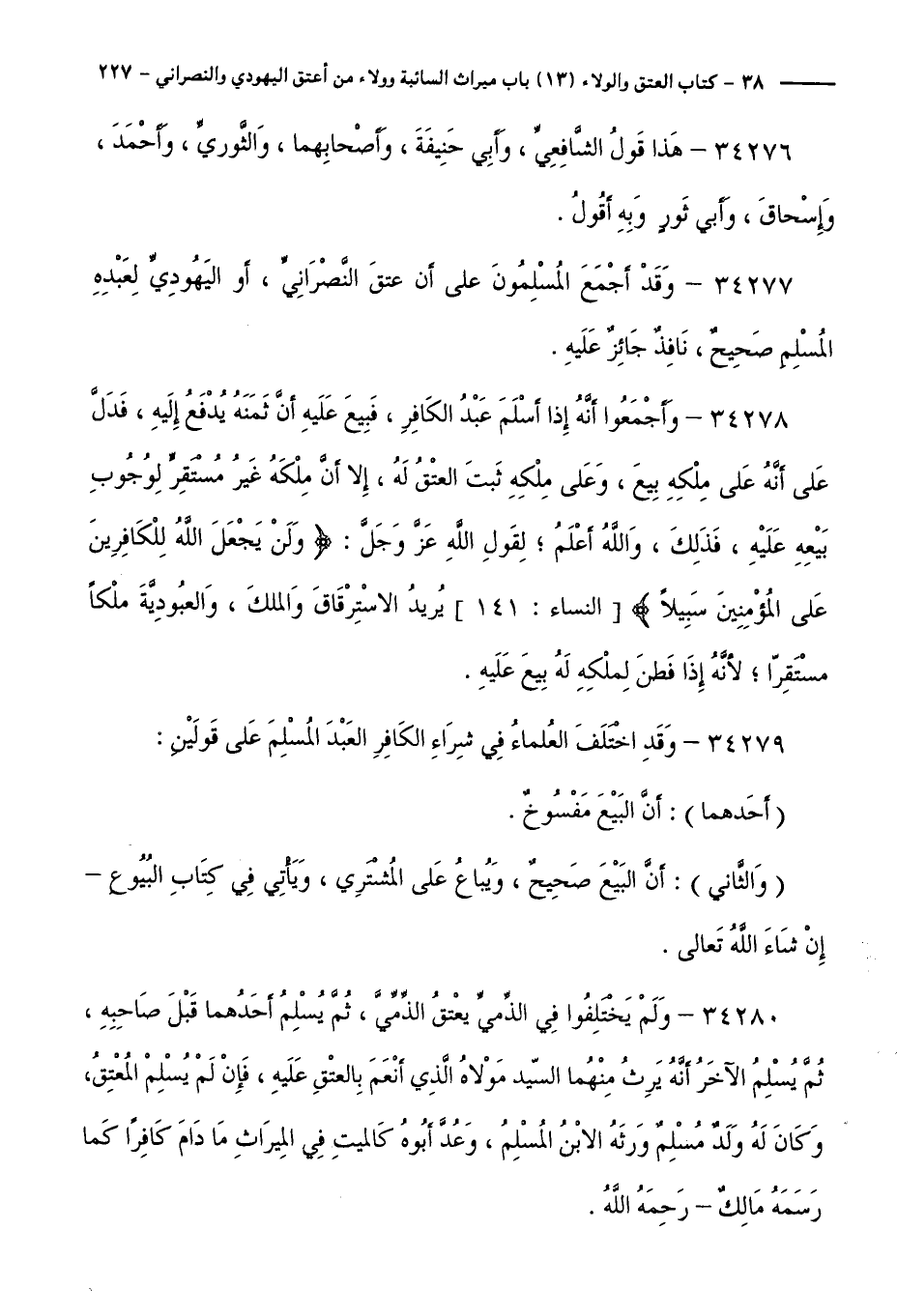 34280 - وَلَمْ يَخْتَلِفُوا فِي الذِّمِّيِّ يَعْتِقُ الذِّمِّيَّ، ثُمَّ يُسْلِمُ أَحَدُهُمَا قَبْلَ صَاحِبِهِ، ثُمَّ يُسْلِمُ الْآخَرُ أَنَّهُ يَرِثُ مِنْهُمَا السَّيِّدُ مَوْلَاهُ الَّذِي أَنْعَمَ بِالْعِتْقِ عَلَيْهِ، فَإِنْ لَمْ يُسْلِمِ الْمُعْتِقُ، وَكَانَ لَهُ وَلَدٌ مُسْلِمٌ وَرِثَهُ الِابْنُ الْمُسْلِمُ، وَعُدَّ أَبُوهُ كَالْمَيِّتِ فِي الْمِيرَاثِ مَا دَامَ كَافِرًا كَمَا رَسَمَهُ مَالِكٌ - رَحِمَهُ اللَّهُ.