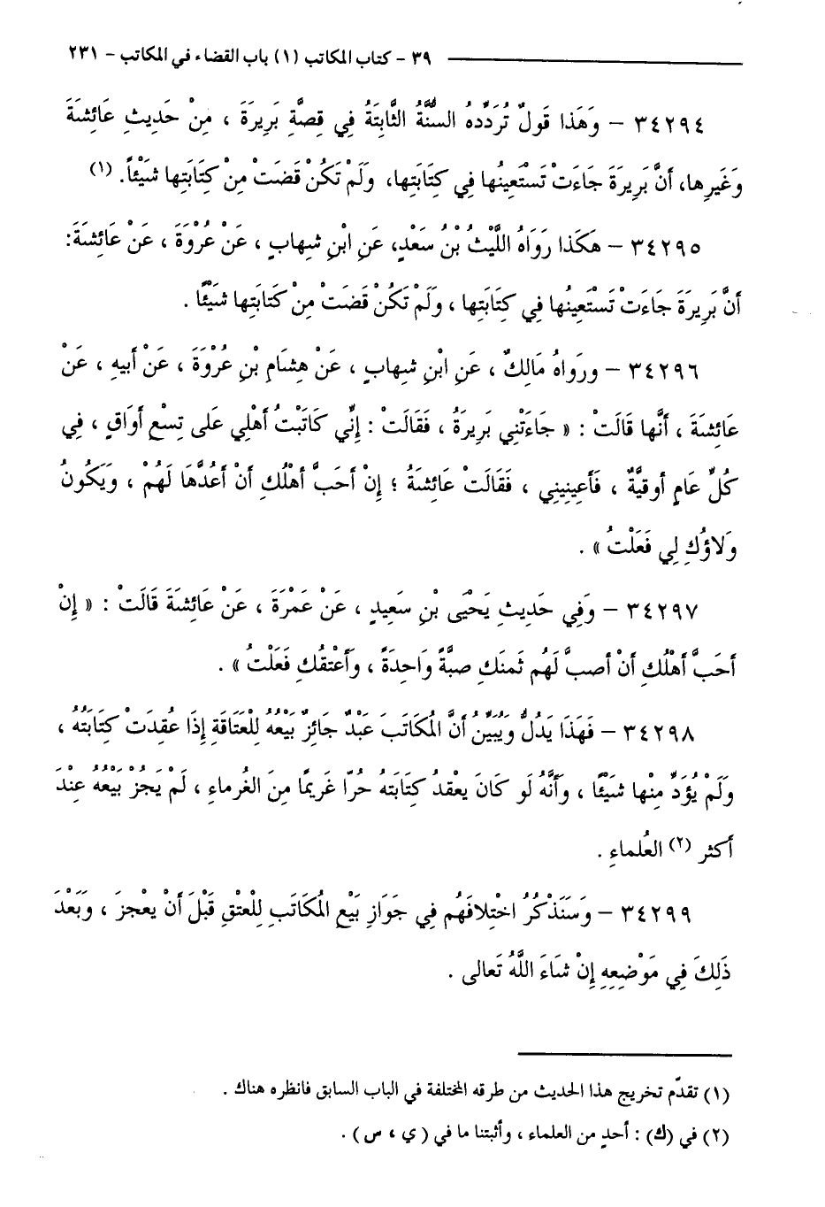 34296 - وَرَوَاهُ مَالِكٌ، عَنِ ابْنِ شِهَابٍ، عَنْ هِشَامِ بْنِ عُرْوَةَ، عَنْ أَبِيهِ، عَنْ عَائِشَةَ، أَنَّهَا قَالَتْ: ( ( جَاءَتْنِي بَرِيرَةُ، فَقَالَتْ: إِنِّي كَاتَبْتُ أَهْلِي عَلَى تِسْعِ أَوَاقٍ، فِي كُلِّ عَامٍ أُوقِيَّةً، فَأَعِينِينِي، فَقَالَتْ: عَائِشَةُ ; إِنْ أَحَبَّ أَهْلُكِ أَنْ أَعُدُّهَا لَهُمْ، وَيَكُونُ وَلَاؤُكِ لِي فَعَلْتُ ) ).