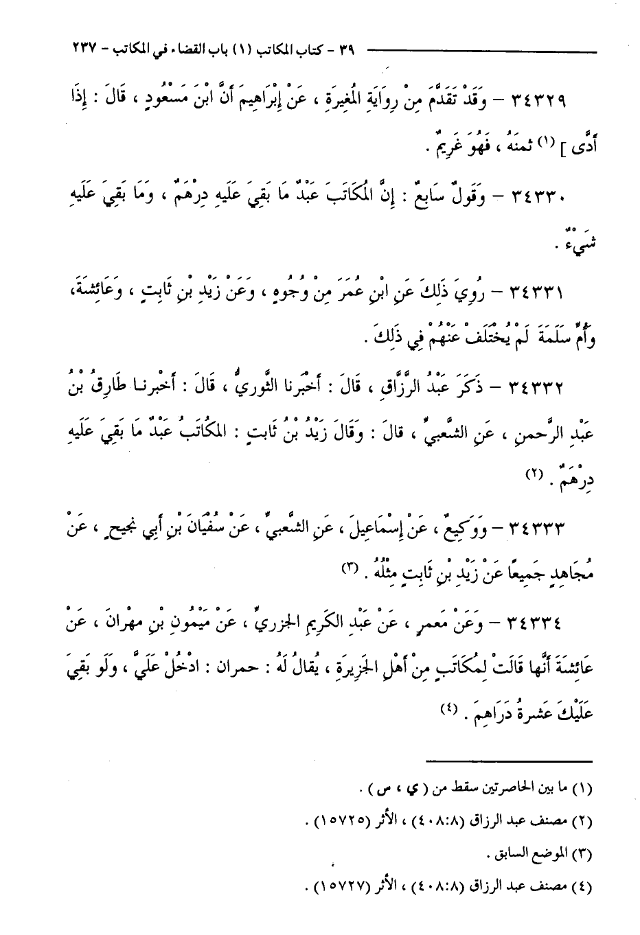 34332 - ذَكَرَ عَبْدُ الرَّزَّاقِ، قَالَ: أَخْبَرَنَا الثَّوْرِيُّ، قَالَ: أَخْبَرَنَا طَارِقُ بْنُ عَبْدِ الرَّحْمَنِ، عَنِ الشَّعْبِيِّ، قَالَ: وَقَالَ زَيْدُ بْنُ ثَابِتٍ: الْمُكَاتَبُ عَبْدٌ مَا بَقِيَ عَلَيْهِ دِرْهَمٌ.
