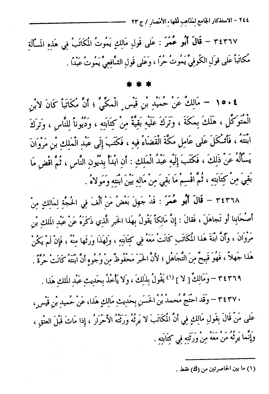 34368 - قَالَ أَبُو عُمَرَ: قَدْ جَهِلَ بَعْضُ مَنْ أَلَّفَ فِي الْحُجَّةِ لِمَالِكٍ مِنْ أَصْحَابِنَا أَوْ تَجَاهَلَ، فَقَالَ: إِنَّ مَالِكًا يَقُولُ بِهَذَا الْخَبَرِ الَّذِي ذَكَرَهُ عَنْ عَبْدِ الْمَلِكِ بْنِ مَرْوَانَ، وَأَنَّ ابْنَةَ هَذَا الْمُكَاتَبِ كَانَتْ مَعَهُ فِي كِتَابَتِهِ، وَلِهَذَا وَرِثَهَا مِنْهُ، فَإِنْ لَمْ يَكُنْ هَذَا جَهْلًا، فَهُوَ قَبِيحٌ مِنَ التَّجَاهُلِ ; لِأَنَّ الْخَبَرَ الْمَحْفُوظَ مِنْ وُجُوهٍ أَنَّ ابْنَتَهُ كَانَتْ حُرَّةً.