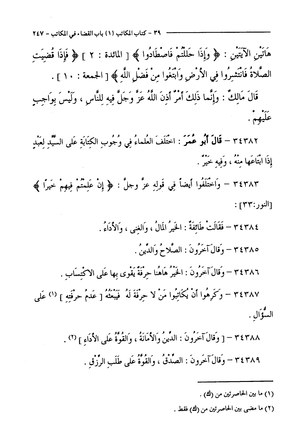 34383 - وَاخْتَلَفُوا أَيْضًا فِي قَوْلِهِ عَزَّ وَجَلَّ:إِنْ عَلِمْتُمْ فِيهِمْ خَيْرًا [ النُّورِ: 33 ].