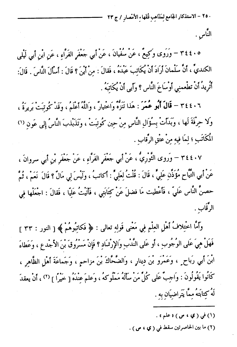 34407 - وَرَوَى الثَّوْرِيُّ، عَنْ أَبِي جَعْفَرٍ الْفَرَّاءِ، عَنْ جَعْفَرِ بْنِ أَبِي سَرْوَانَ، عَنْ أَبِي التَّيَّاحِ مُؤَذِّنِ عَلِيٍّ، قَالَ: قُلْتُ لَعَلِيٍّ: أُكَاتِبُ، وَلَيْسَ لِي مَالٌ ؟ قَالَ: نَعَمْ، ثُمَّ حَصَّنَ النَّاسَ عَلَيَّ، فَأُعْطِيتُ مَا فَضَلَ عَنْ كِتَابَتِي، فَأَتَيْتُ عَلِيًّا، فَقَالَ: اجْعَلْهَا فِي الرِّقَابِ. وَأَمَّا اخْتِلَافُ أَهْلِ الْعِلْمِ فِي مَعْنَى قَوْلِهِ تَعَالَى:فَكَاتِبُوهُمْ [ النُّورِ: 33 ] فَهَلْ هِيَ عَلَى الْوُجُوبِ، أَوْ عَلَى النَّدْبِ وَالْإِرْشَادِ ؟ فَإِنَّ مَسْرُوقَ بْنَ الْأَجْدَعِ، وَعَطَاءَ بْنَ أَبِي رَبَاحٍ، وَعَمْرَو بْنَ دِينَارٍ، وَالضَّحَّاكَ بْنَ مُزَاحِمٍ، وَجَمَاعَةَ أَهْلِ الظَّاهِرِ، كَانُوا يَقُولُونَ: وَاجِبٌ عَلَى كُلِّ مَنْ سَأَلَهُ مَمْلُوكُهُ، وَعَلِمَ عِنْدَهُ خَيْرًا، أَنْ يَعْقِدَ لَهُ كِتَابَتَهُ مِمَّا يَتَرَاضَيَانِ بِهِ.