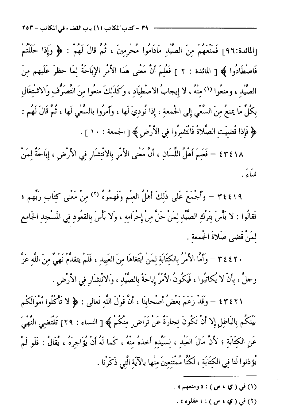 34420 - وَأَمَّا الْأَمْرُ بِالْكِتَابَةِ لِمَنِ ابْتَغَاهَا مِنَ الْعَبِيدِ، فَلَمْ يَتَقَدَّمْ نَهْيٌ مِنَ اللَّهِ عَزَّ وَجَلَّ، بِأَنْ لَا يُكَاتَبُوا، فَيَكُونُ الْأَمْرُ إِبَاحَةً بِالصَّيْدِ، وَالِانْتِشَارِ فِي الْأَرْضِ.