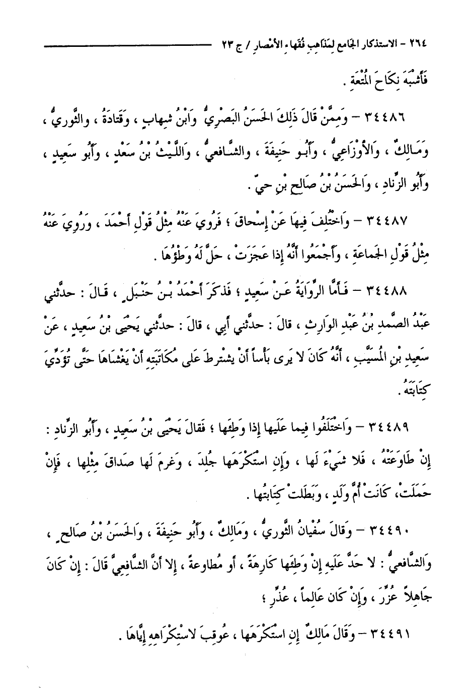 34486 - وَمِمَّنْ قَالَ ذَلِكَ الْحَسَنُ الْبَصْرِيُّ، وَابْنُ شِهَابٍ، وَقَتَادَةُ، وَالثَّوْرِيُّ، وَمَالِكٌ، وَالْأَوْزَاعِيُّ، وَأَبُو حَنِيفَةَ، وَالشَّافِعِيُّ، وَاللَّيْثُ بْنُ سَعْدٍ، وَأَبُو سَعِيدٍ، وَأَبُو الزِّنَادِ، وَالْحَسَنُ بْنُ صَالِحِ بْنِ حَيٍّ.