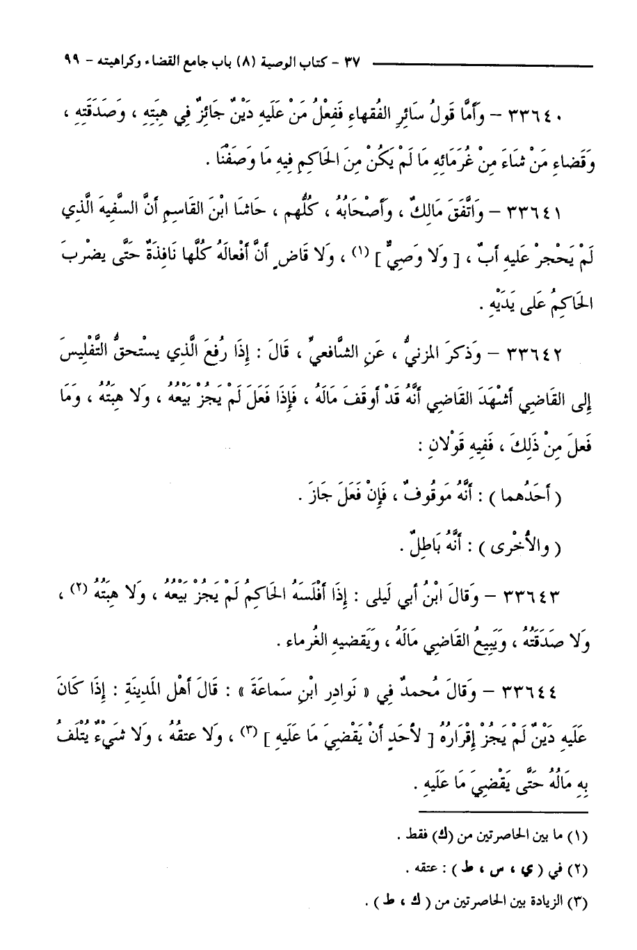 33641 - وَاتَّفَقَ مَالِكٌ وَأَصْحَابُهُ، كُلُّهُمْ حَاشَا ابْنِ الْقَاسِمِ أَنَّ السَّفِيهَ الَّذِي لَمْ يَحْجُرْ عَلَيْهِ أَبٌ، وَلَا وَصِيٌّ، وَلَا قَاضٍ أَنَّ أَفْعَالَهُ كُلَّهَا نَافِذَةٌ حَتَّى يَضْرِبَ الْحَاكِمُ عَلَى يَدَيْهِ.