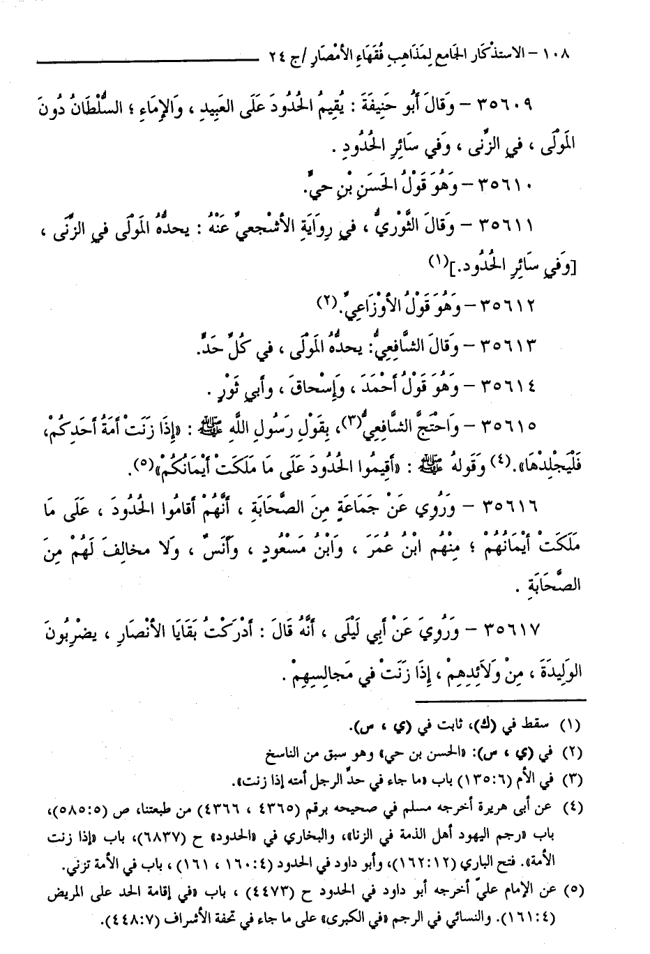35616 - وَرُوِيَ عَنْ جَمَاعَةٍ مِنَ الصَّحَابَةِ، أَنَّهُمْ أَقَامُوا الْحُدُودَ، عَلَى مَا مَلَكَتْ أَيْمَانُهُمْ ؛ مِنْهُمُ ابْنُ عُمَرَ، وَابْنُ مَسْعُودٍ، وَأَنَسٌ، وَلَا مُخَالِفَ لَهُمْ مِنَ الصَّحَابَةِ.