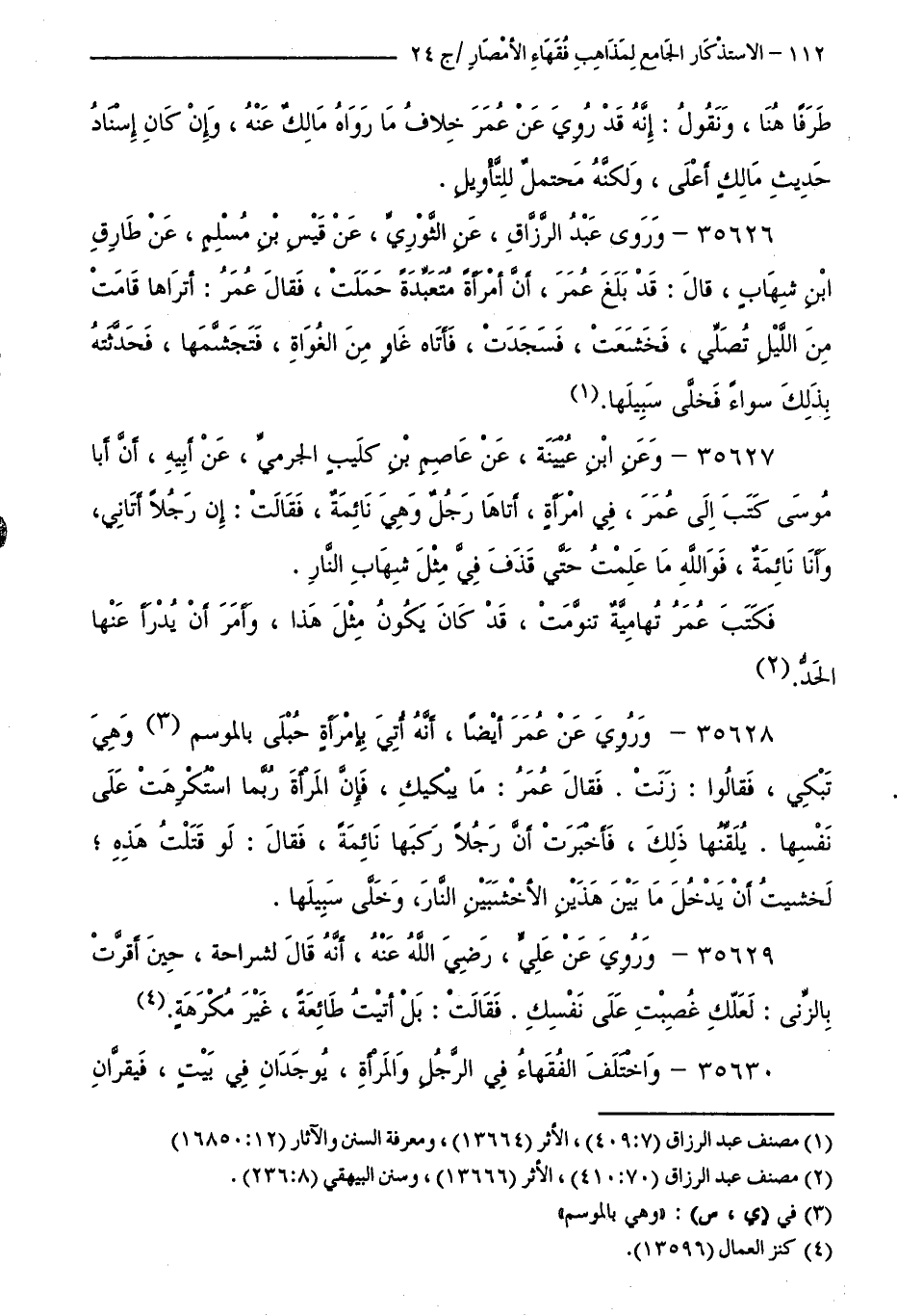 35626 - وَرَوَى عَبْدُ الرَّزَّاقِ، عَنِ الثَّوْرِيِّ، عَنْ قَيْسِ بْنِ مُسْلِمٍ، عَنْ طَارِقِ بْنِ شِهَابٍ، قَالَ: قَدْ بَلَغَ عُمَرَ، أَنَّ امْرَأَةً مُتَعَبِّدَةً حَمَلَتْ، فَقَالَ عُمَرُ: أَتُرَاهَا قَامَتْ مِنَ اللَّيْلِ تُصَلِّي، فَخَشَعَتْ، فَسَجَدَتْ، فَأَتَاهَا غَاوٍ مِنَ الْغُوَاةِ، فَتَجَشَّمَهَا، فَحَدَّثَتْهُ بِذَلِكَ سَوَاءً فَخَلَّى سَبِيلَهَا.