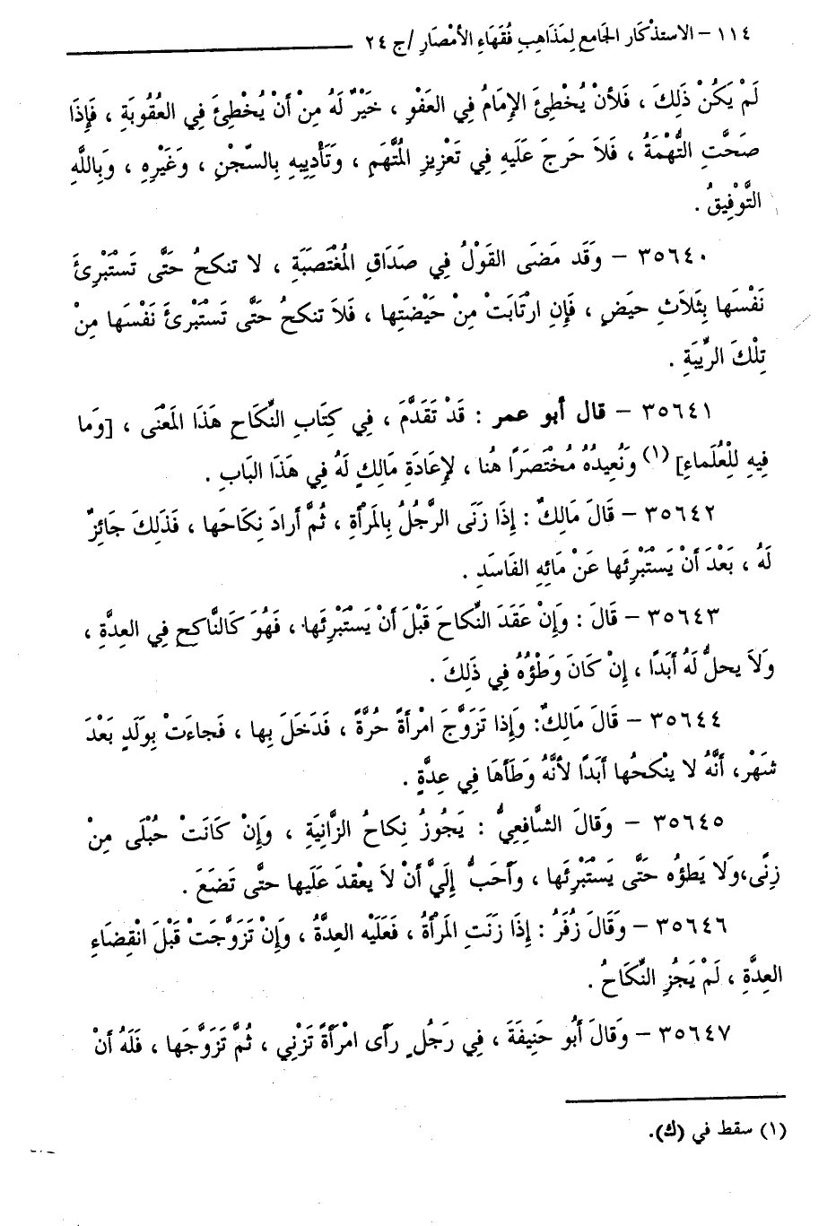 35642 - قَالَ مَالِكٌ: إِذَا زَنَى الرَّجُلُ بِالْمَرْأَةِ، ثُمَّ أَرَادَ نِكَاحَهَا، فَذَلِكَ جَائِزٌ لَهُ، بَعْدَ أَنْ يَسْتَبْرِئَهَا عَنْ مَائِهِ الْفَاسِدِ.