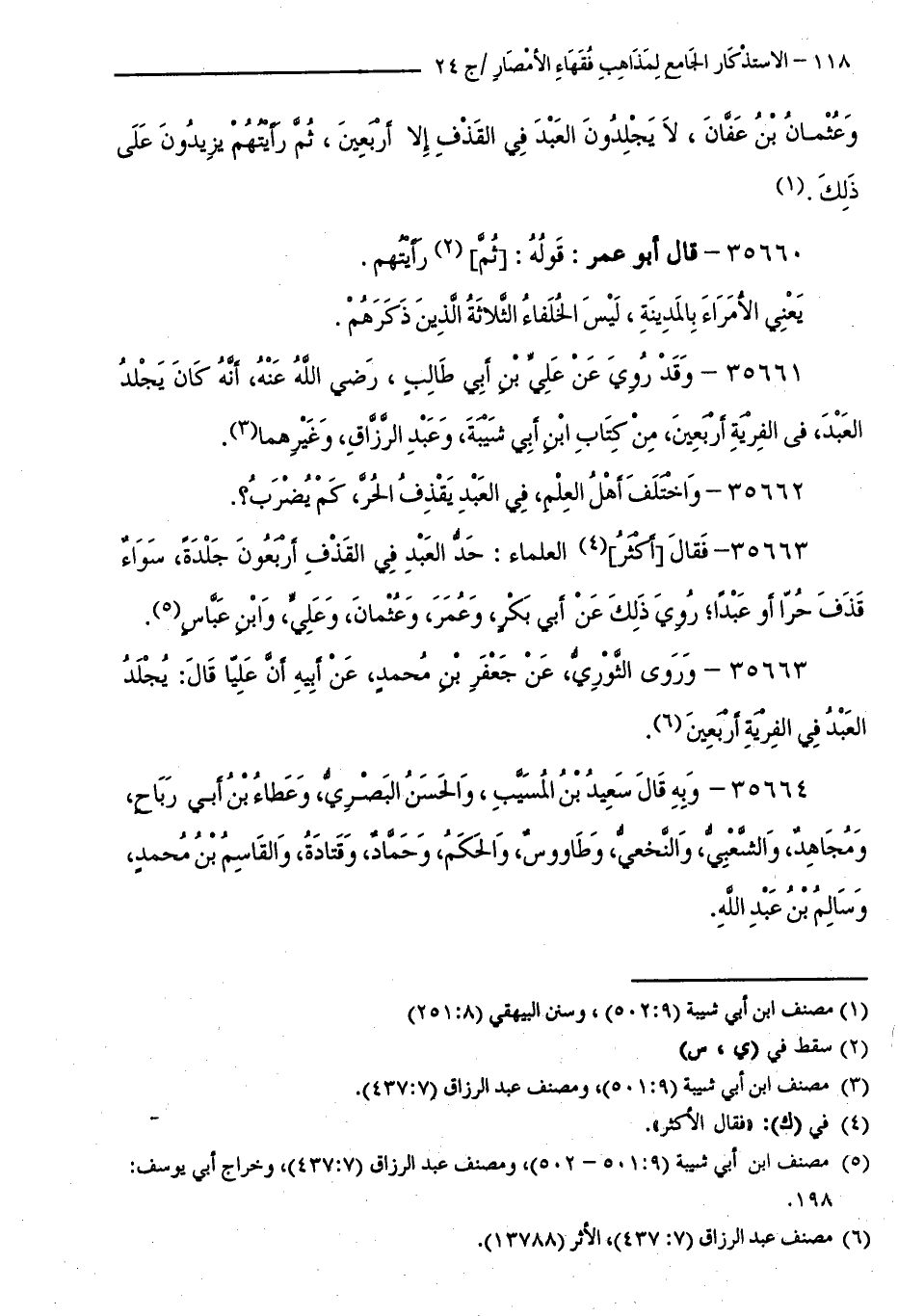 35661 - وَقَدْ رُوِيَ عَنْ عَلِيِّ بْنِ أَبِي طَالِبٍ - رَضِيَ اللَّهُ عَنْهُ - أَنَّهُ كَانَ يَجْلِدُ الْعَبْدَ فِي الْفِرْيَةِ أَرْبَعِينَ، مِنْ كِتَابِ ابْنِ أَبِي شَيْبَةَ، وَعَبْدِ الرَّزَّاقِ، وَغَيْرِهِمَا.