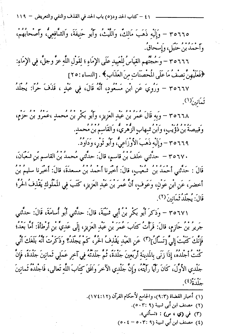 35671 - وَذَكَرَ أَبُو بَكْرِ بْنُ أَبِي شَيْبَةَ، قَالَ: حَدَّثَنِي أَبُو أُسَامَةَ، قَالَ: حَدَّثَنِي جَرِيرُ بْنُ حَازِمٍ، قَالَ: قَرَأْتُ كِتَابَ عُمَرَ بْنِ عَبْدِ الْعَزِيزِ، إِلَى عَدِيِّ بْنِ أَرْطَأَةَ: أَمَّا بَعْدُ ؛ فَإِنَّكَ كَتَبْتَ إِلَيَّ تَسْأَلُ عَنِ الْعَبْدِ يَقْذِفُ الْحُرَّ، كَمْ يُجْلَدُ ؟ وَذَكَرْتَ أَنَّهُ بَلَغَكَ أَنِّي كُنْتُ أَجْلِدُهُ، إِذَا زَنَى بِالْمَدِينَةِ أَرْبَعِينَ جَلْدَةً، ثُمَّ جَلَدْتُهُ فِي آخِرِ عَمَلِي ثَمَانِينَ جَلْدَةً، فَإِنَّ جَلْدِي الْأَوَّلَ كَانَ رَأْيًا رَأَيْتُهُ، وَإِنَّ جَلْدِي الْآخِرَ وَافَقَ كِتَابَ اللَّهِ تَعَالَى، فَاجْلِدْهُ ثَمَانِينَ جَلْدَةً.